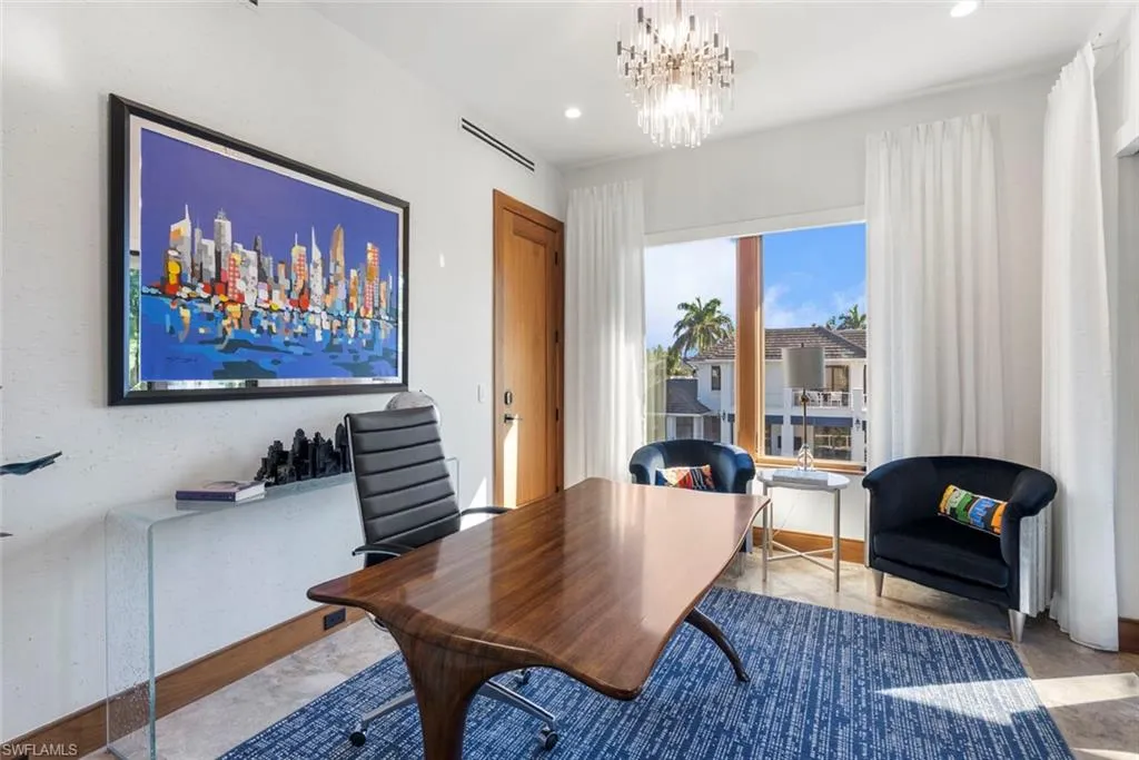 A rooftop terrace provides panoramic views of the coastline, breathtaking sunsets, and the Naples skyline. The southwest-facing lanai features a vanishing-edge saltwater pool, expansive covered entertaining areas protected by screens and shutters, and meticulously designed tropical landscaping. Combining architectural integrity, global inspiration, and an unmatched location, this residence defines a warm and inviting luxury along the Naples coast.