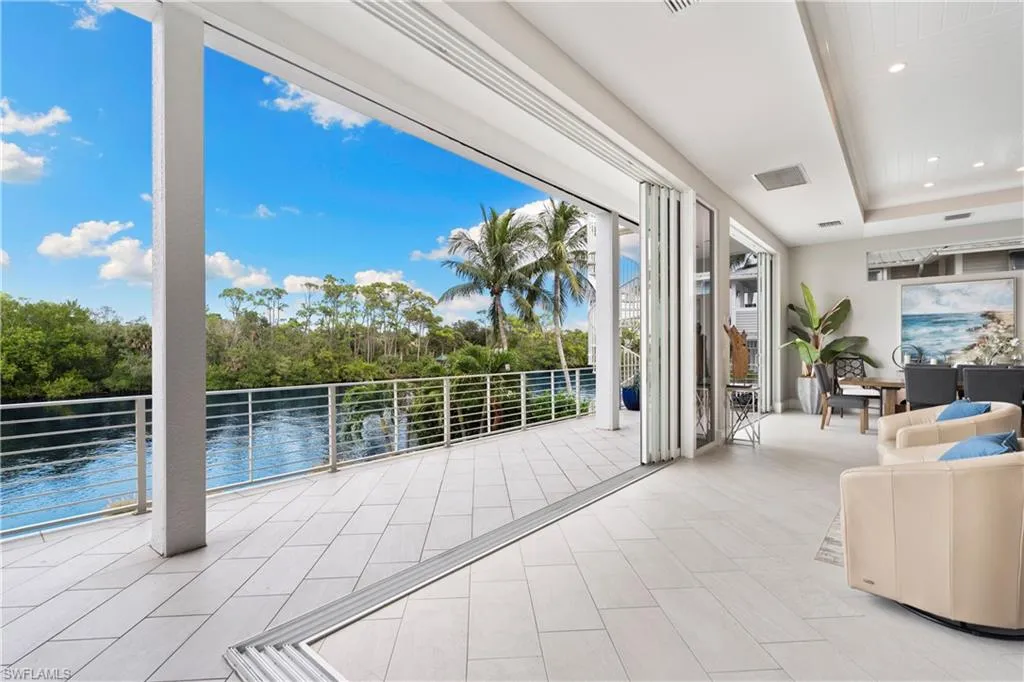 Coastal contemporary riverfront home with beautiful water views from nearly every window. Experience breathtaking long river views with a protected preserve park beyond, offering exceptional privacy. A true beach and boater’s paradise, this property is just a short walk or bike ride to Bonita Beach and Barefoot Beach, and offers Gulf-access with the ideal boating setup including a private dock, covered lift, and tiki hut. Built in 2015 by renowned Potter Homes, this residence was constructed like a fortress with all-concrete construction, hurricane-impact windows and doors, and a metal roof. Fantastic open floor plan with over 5,000 sq ft under air, 5 bedrooms + den, 6.5 baths, and a 4-car garage. The chef’s kitchen boasts dual-toned countertops, white cabinetry, a gas range, and a beautiful stone tile backsplash. Perfect for entertaining, the living room offers beautiful tray ceilings and 10-foot sliders that open to the spacious lanai with electric screens, a fireplace, and a built-in grill, all overlooking the resort-style backyard with a large heated pool, spa, and private beach area. Primary suite is located on the main living floor and offers direct lanai access and a spa-like bath featuring dual vanities, a tub, and a large walk-in shower. Upstairs, enjoy additional bedrooms and living space along with an expansive balcony with panoramic water views. Additional highlights include a private elevator, 22kW generator, newly painted exterior, and ground-level flex space. With no HOA fees or rental restrictions, this property also presents an excellent investment opportunity. Ideally located near top dining and shopping, just minutes from Mercato, The Promenade, Waterside Shops, Coconut Point, 5th Avenue, and the International Airport.