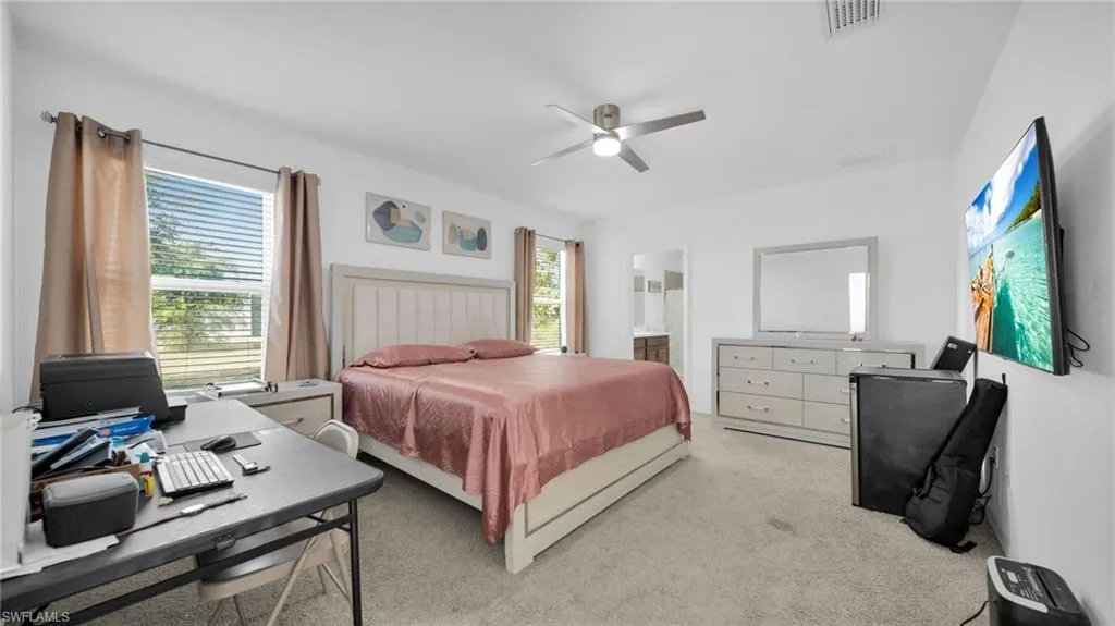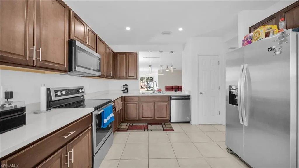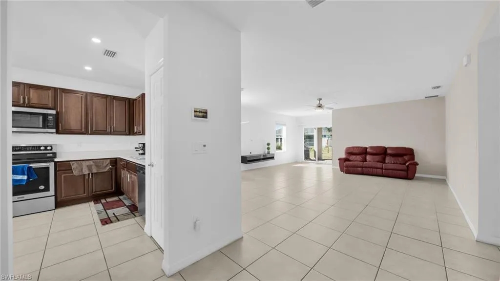 Welcome home to this charming 3-bedroom, 2-bathroom single-story residence, offering 1,747 sq. ft. of comfortable, modern living space. From the moment you arrive, you’ll love the beautiful brick-paver driveway and inviting curb appeal that set the tone for what’s inside. Step into a bright, open living area featuring easy-to-maintain tile flooring, while the bedrooms offer soft carpet flooring for added comfort. The spacious kitchen is designed for both style and functionality, complete with stainless steel appliances, quartz countertops, and ample cabinetry. A washer and dryer are included, making this home truly move-in ready. The thoughtfully designed split-floor plan provides privacy for the primary suite, while the additional bedrooms offer flexibility for family, guests, or a home office. Both bathrooms are upgraded with sleek quartz countertops for a modern touch. Step outside to a large backyard, enhanced by a well-maintained playground that adds extra enjoyment to the space. Here’s a major benefit: THE SELLER HAS ALREADY PAID THE WATER AND SEWER ASSESSMENTS, significant long-term savings and an exceptional value you won’t find everywhere. For added peace of mind, this home comes equipped with an state of the art CCTV system including 7 cameras and ample data storage. Located close to shopping, dining, and everyday conveniences, this home offers comfort, value, and Florida living at its finest. Don’t miss out on this incredible opportunity!