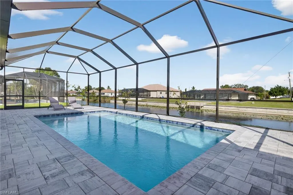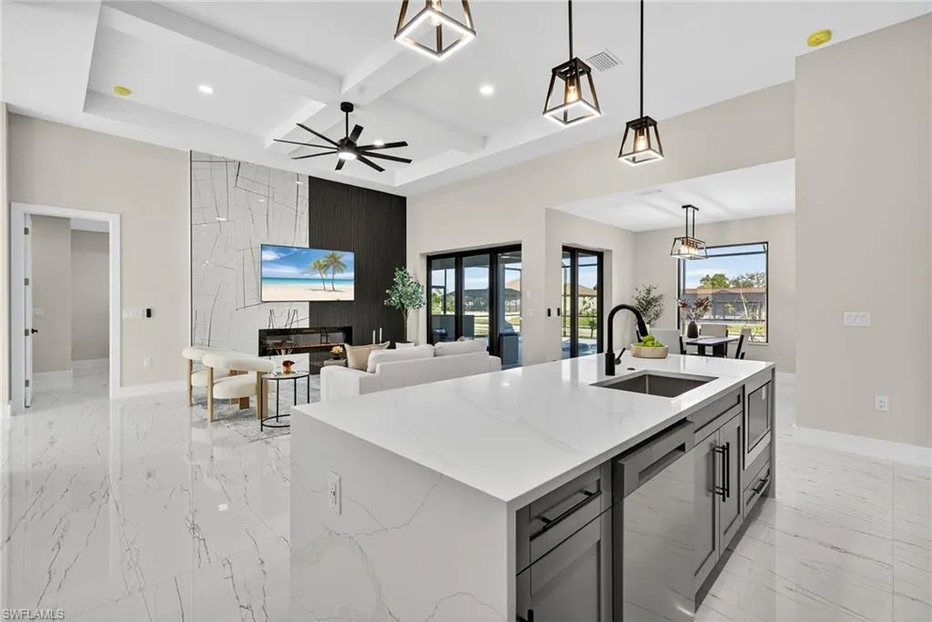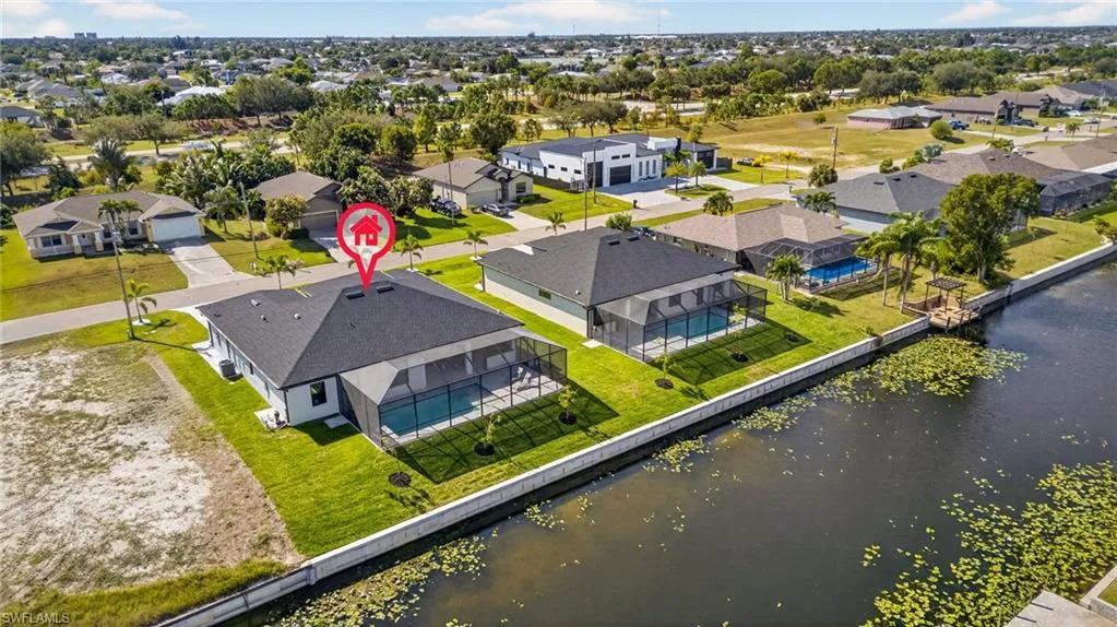 Beautiful, never-lived-in new construction luxury home on a freshwater canal in highly desirable SW Cape Coral. NOT IN A FLOOD ZONE and NO HOA! Thoughtfully designed with elegant landscaping and mature palm trees, this home welcomes you with soaring coffered tray ceilings and a stunning entertainment wall featuring a mounted television and electric fireplace.