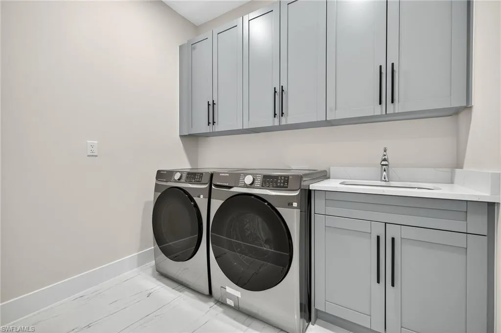 The kitchen features custom cabinetry, abundant storage and quartz countertops. A large laundry room offers built-in cabinets, a utility sink, and a washer and dryer already included.