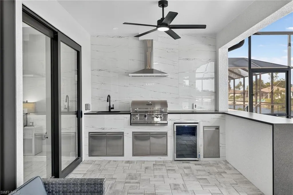 Enjoy outdoor living on the screened lanai with a sparkling pool and sun shelf, along with an outdoor kitchen equipped with a sink and wine refrigerator, perfect for entertaining. FURNISHINGS ARE NEGOTIABLE, giving you the option to move right in with ease.