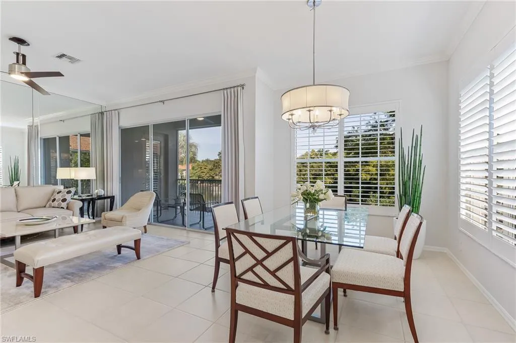 The spacious living and dining areas flow effortlessly to the screened lanai, where expansive sliding glass doors frame long lake views and peaceful wooded preserves—an ideal backdrop for relaxing or entertaining.