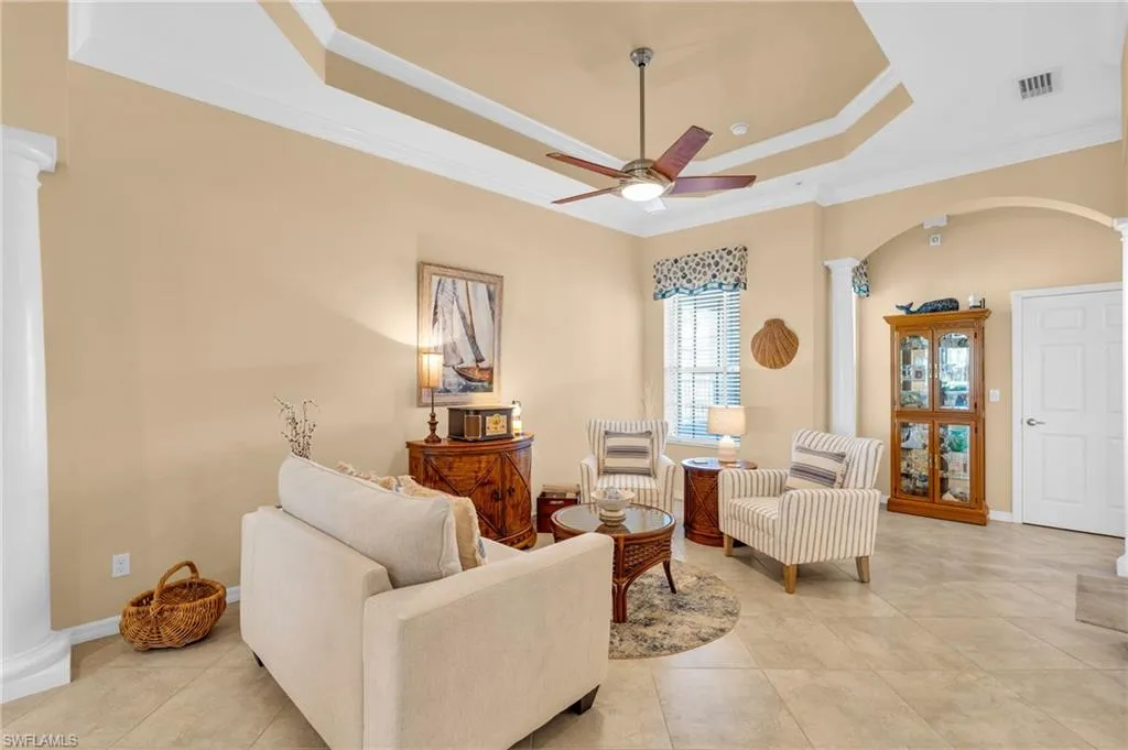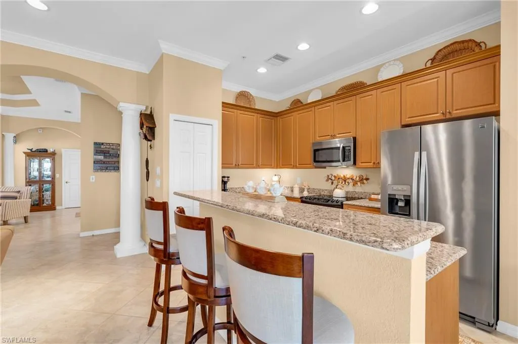 Welcome to the Meadows of Estero—where luxury, convenience, and comfort come together in one of Estero’s most sought-after communities. Perfectly positioned between Naples and Fort Myers, this gated neighborhood offers effortless access to world-class beaches, premier shopping and dining, the airport, and everything Southwest Florida has to offer. This 2nd floor corner residence impresses from the start with a brand-new roof, fresh exterior paint, and a spacious two-car garage. Step inside and experience over 2,800 sq. ft. of air-conditioned living area, beautifully furnished, and move-in-ready — yes, all furnishings (with minimal exceptions) are included! The open, light-filled great room features neutral tile floors and flows seamlessly into a gorgeous kitchen outfitted with granite countertops, wood cabinetry, a breakfast bar, and a charming nook with peaceful preserve views. Elegant touches—tray ceilings, crown molding throughout, custom paint, and designer window treatments—add sophistication throughout. The expansive owner’s suite is a true retreat, offering private lanai access, space for a cozy sitting area, and a luxury bath with a soaking tub, dual sinks, a large walk-in shower, and impressive closet storage. An interior laundry room with cabinetry, counter space, and a utility sink adds everyday convenience. Enjoy the Florida lifestyle on the spacious lanai, complete with electric (and manually operable) “Storm Smart” hurricane screens—the perfect setting for relaxing or entertaining while overlooking your private, tranquil preserve. The open floor plan includes a dedicated space for a future elevator (currently used as extra storage), while guest bedrooms are thoughtfully separated for maximum privacy. Guests will also appreciate a generous bath with dual sinks and a walk-in shower, plus a convenient half bath for gatherings. Buy with confidence—Meadows of Estero has strong financials and no outstanding assessments. HOA fees cover interior/exterior water, cable, internet, landscaping, professional management, and an on-site representative for peace of mind. Residents enjoy a vibrant lifestyle with an active social calendar, fitness center, and a community pool and spa. Pet friendly! Two dogs allowed (up to 100 lbs each; no aggressive breeds). This impeccably maintained, fully furnished home is the perfect blend of luxury, comfort, and convenience—ready for you to move in and start living the Florida dream.