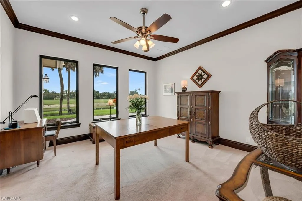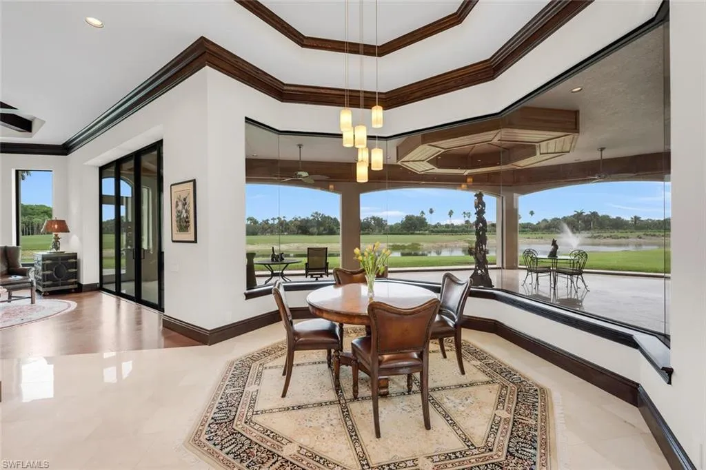 A magnificently custom-designed estate, (2016), where timeless craftsmanship meets modern luxury! Showcased on one acre, overlooking the 4th fairway of Twin Eagles Golf & Country Club’s revered Talon Course, this home offers sweeping views of the lake and golf course from nearly every room! An additional four acres of land extend into the water and fairway, offering an unmatched sense of privacy and space. Warm, rich wood finishes, harmonized with other materials, set the tone of refined comfort and tranquility. Mahoghany and Leaded Glass doors, stained Oak trim, crown molding and solid doors, Cherry soft-close cabinetry throughout, Travertine stone gas fireplace with twisted Juniper mantel, as well as Walnut and Marble floors define the essence and character of the home. Encompassed in 5,493sf, this ranch-style home has a sense of casual sophistication, tailored for everyday living, as well as grand entertaining. Centered around a spacious gourmet kitchen, with gas-cooking on professional-grade Wolf appliances, Sub-Zero Refrigerator/Freezer and a generous walk-in pantry, this home features 4 en-suite bedrooms, 5.5 bathrooms, a large game room with wet bar, two 2-car garages (4 bays) and 3 zoned HVAC systems, to mention a few. Upgrades include a whole house generator, hurricane impact glass throughout, plus electric shutters and screens for the oversized patio, for added comfort and security. Twin Eagles Golf & Country Club is abundant in wildlife and natural beauty. Residents often spot deer, wild turkeys and a variety of birds throughout the community. The Club offers a wide range of amenities, including golf, tennis, pickle ball, bocce, a fitness center with classes, a variety of hobbies, dining and social activities, for members to enjoy. Club membership is mandatory and the new homeowners can choose from golf, sports or social membership.