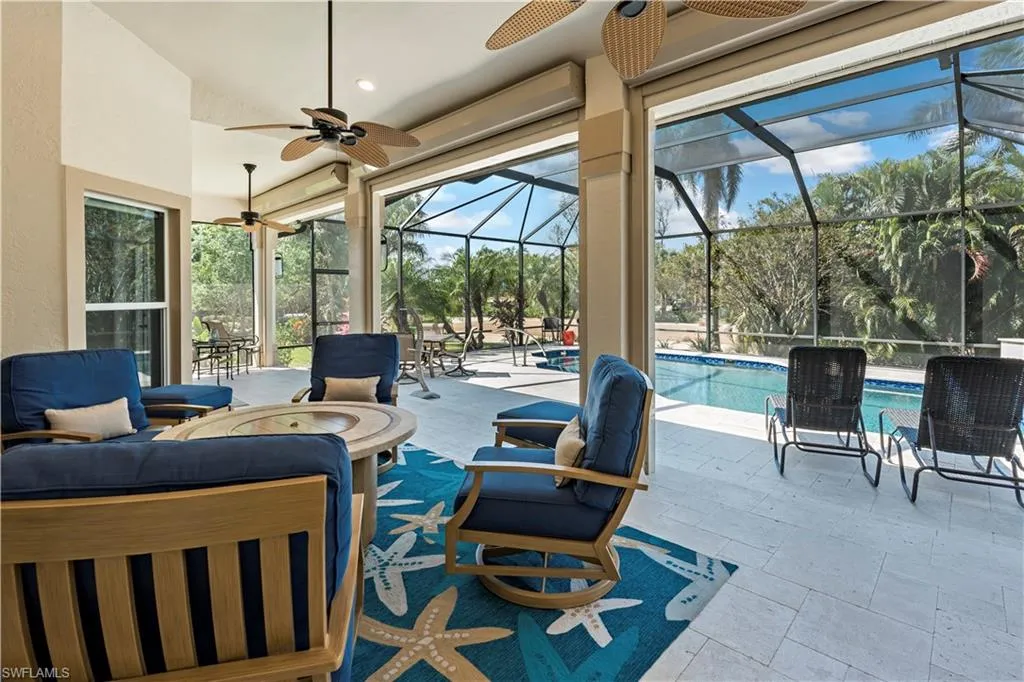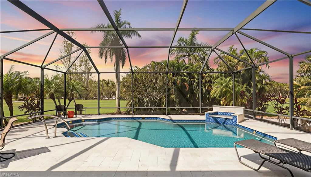 Outdoors, a resort-caliber pool is framed by an expansive travertine deck, enhanced by an architectural picture-window screen enclosure—a dramatic statement piece that blurs the line between inside and out.
