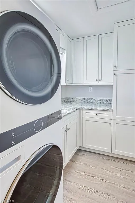 Nature’s stage is set for Dolphins jumping, Manatees floating and Pelicans diving headfirst into the water – just a few of the daily events you will witness from this bay front condo. The views offer an ever-changing, stunning backdrop from the screened lanai, living / dining area, kitchen, and primary in-suite. Located on the 3rd floor, this condo offers you vaulted ceilings – so no one is directly above and you experience the additional volume increasing the overall sense of space. Renovations with neutral, coastal updates have taken place over the past few years, making everything fresh and current. Upgrades include all wood kitchen cabinets, quartz counter tops, a breakfast bar, SS appliances with the refrigerator being the most recently replaced. More recent updates include the addition of medicine cabinets and exhaust fans in both bathrooms as well as lighting over the primary bathroom dual sinks, blinds throughout with remotes for the living room slider and ceiling fans in both bedrooms, living area and lanai. The most recent improvement includes adding a pocket door to the laundry room, new stacked washer & dryer, cabinetry for additional storage, as well as a soaking sink. For peace of mind and safety, the windows and sliding glass doors have been replaced with impact glass. Not only has the interior been updated, but much of the exterior has been addressed as well, including new stairs and front decks, tropical landscape, walking decks and boat docks. Future exterior improvements include new paint on the buildings and new Pickleball and tennis courts. Further refurbished amenities include 2 pools, BBQ areas, kayak storage and boat docks.