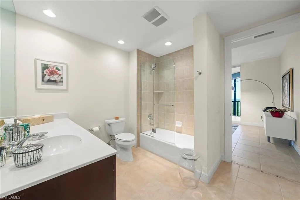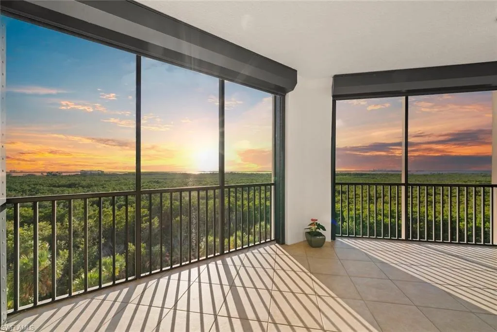 Commanding unobstructed views of Estero Bay from its fourth-floor vantage point, this three-bedroom, two-and-one-half-bath residence elevates coastal living with a sophisticated fusion of privacy, craftsmanship, and curated design. The split-bedroom floor plan ensures an exceptional sense of serenity for residents and guests, with each suite thoughtfully placed for comfort and seclusion. Inside, refined selections and designer furnishings establish an atmosphere of understated luxury. Sculptural Roche Bobois living and dining pieces anchor the main living area, complemented by an iconic tulip chair in the den that lends a touch of mid-century elegance. Tasteful artwork chosen to mirror the colors and movement of the bay creates a gallery-like aesthetic, enriching the home’s sense of style without overpowering its natural surroundings. Hurricane-impact rated glass and storm shutters on the screened lanai provide confidence in all conditions while allowing Florida’s luminous natural light to fill the space. The expansive lanai extends the living area outdoors, offering an idyllic setting for savoring Estero Bay’s legendary sunsets. The residence is offered furnished and features stainless steel appliances, tile flooring in main areas, and an open-concept layout ideal for effortless entertaining. Two covered, enclosed parking spaces and ground-level private storage add everyday convenience. Within the community, resort-inspired amenities—including a resort style, tropical pool, spa, and grilling pavilion—further enhance the lifestyle. Ideally located near premier Gulf beaches, dining, and boutique shopping, this residence presents a rare opportunity to experience elevated Southwest Florida living with minimal maintenance and maximum elegance.