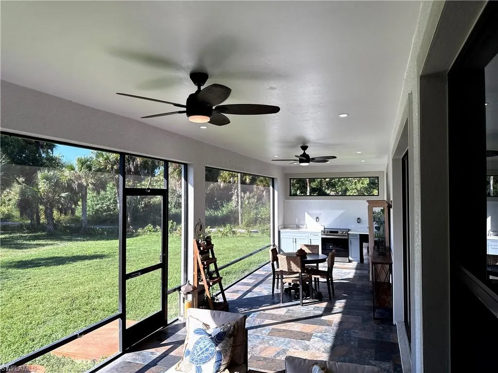 Exterior enhancements elevate both form and function. The property offers two separate entrances for flexible access, plus electrical infrastructure professionally installed along the entire right side of the lot (approx. 660 ft)—ready for a future pool, guest house, RV pad, workshop, or additional structure. Stucco-finished soffits with integrated LED perimeter lighting add nighttime appeal and modern clean lines. A screened lanai with outdoor kitchen provides year-round entertaining space overlooking the expansive acreage.