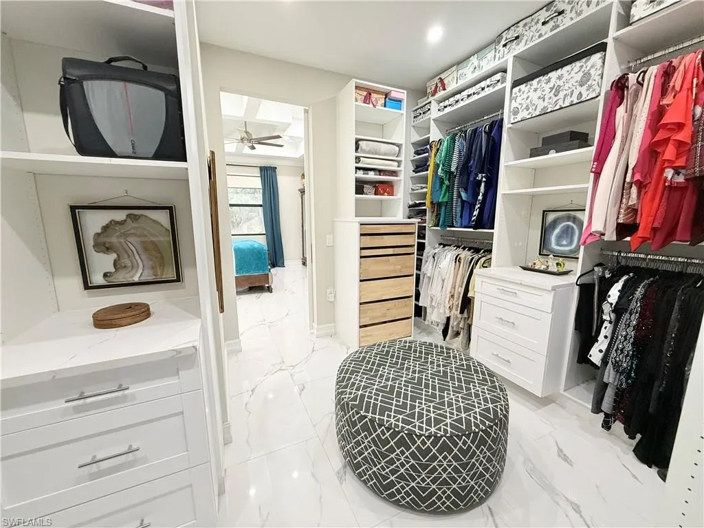The owner’s suite spans one full side of the home for exceptional privacy and comfort, complete with dual walk-in closets enhanced by custom cabinetry. The spa-style bathroom includes a luxurious rainfall shower paired with dual wall-mounted shower heads and independent controls, creating a resort-inspired experience. Each secondary bedroom features walk-in closets with built-in organization, offering both convenience and elevated functionality.