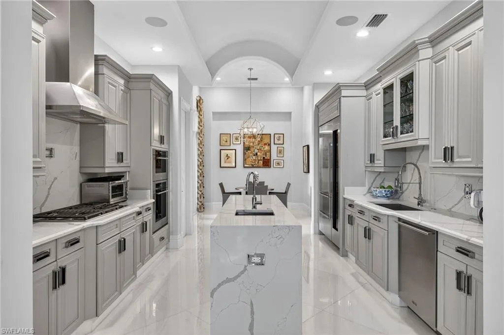 Welcome to the home you have been waiting for! Not a detail was missed in this stunning, completely remodeled single family home. 36″ marble flooring welcomes you into the spacious dining room and salon. The beautiful kitchen features Wolf and Sub-Zero appliances. Enjoy cocktails while watching the sunset over the gorgeous landscaped yard, with a meandering river and stone water feature. Expansive glass sliders frame the view to the refinished pool with mosaic tile, limestone pool deck, and beautiful outdoor kitchen. Other updates include; salt water pool, generator, newer roof, air conditioning, duct work, Impact windows in the primary suite, and picture frame pool enclosure, just to name a few. Located in Norman Estates at Tiburon, the location is ideal and within just a short distance to enjoy all the amenities that Tiburon golf club and The Ritz-Carlton Hotel have to offer, including multiple restaurants and a resort lifestyle. Tiburon is just 1.5 miles to premium shopping and restaurants at Mercato, and only 3 miles to Vanderbilt Beach. Golf memberships are available, but not required. Don’t miss this opportunity, these properties don’t come around often!