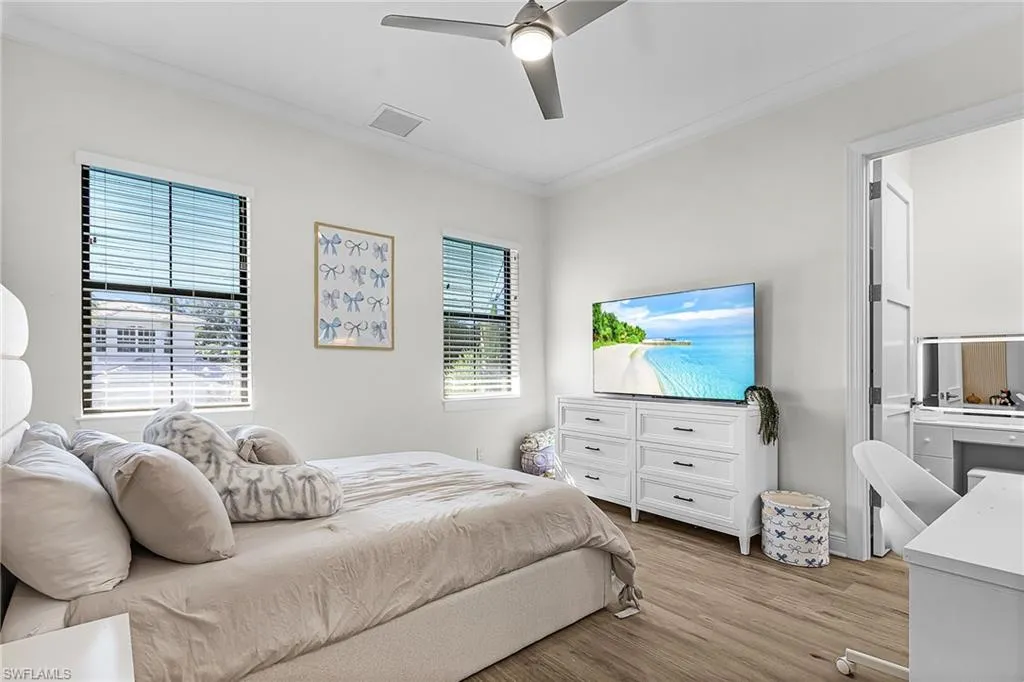 The primary suite offers serene pool views and a spa-inspired bathroom with custom cabinetry, dual vanities, and a large glass-panel shower, featuring elevated 2025 designer selections and upgrades. Guest suites are spacious, private, and finished in luxury vinyl plank flooring.