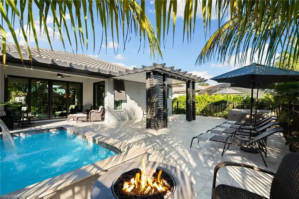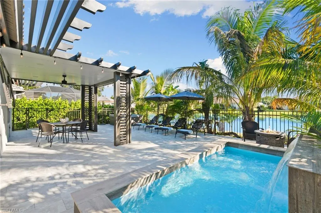 Step outside to discover over 1,000 SQUARE FEET OF PRIVATE OUTDOOR LIVING, including a 25’ x 40’ PATIO with a tranquil WADING POOL AND WATERFALL FEATURE, a FOUR-PERSON JETTED SPA, COVERED LANAI, and an OUTDOOR SHOWER. Surrounded by lush landscaping on a quiet cul-de-sac with lake views alive with native Florida wildlife, this outdoor space offers both serenity and endless opportunities to entertain.