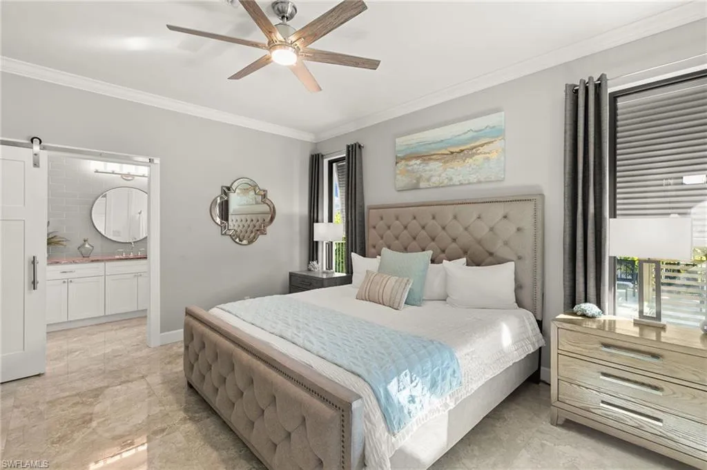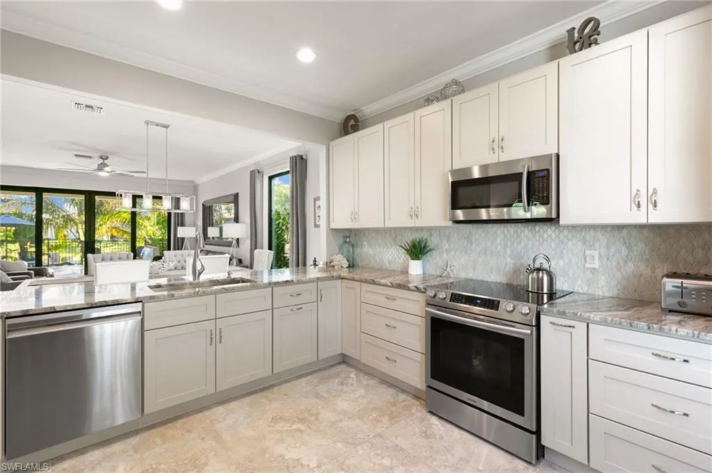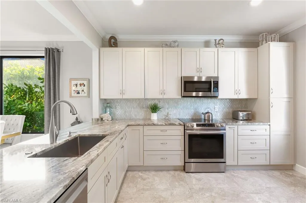 An opportunity like this is rare—a fully remodeled designer home that feels straight out of a luxury interiors magazine. With over $200,000 IN PREMIUM UPGRADES, this modern and refined residence radiates warmth, peace, and timeless sophistication. Inside, 32” x 32” POLISHED PORCELAIN TILE flows seamlessly through the home, complemented by CUSTOM CROWN MOLDING, CRAFTSMAN-STYLE INTERIOR DOORS, BARN DOORS, and SHIPLAP FEATURE WALLS that define a cohesive, elevated aesthetic. The chef’s kitchen is a true showpiece, offering SOLID-WOOD SHAKER CABINETRY, GRANITE COUNTERTOPS, a GLASS-TILE BACKSPLASH, and HIGH-END STAINLESS-STEEL APPLIANCES. The design continues into the laundry room, where MATCHING CABINETRY, GRANITE COUNTERS, and a STACKED SAMSUNG FRONT-LOAD WASHER AND DRYER create a thoughtful, functional workspace. Both bathrooms have been transformed into spa-inspired retreats. The guest bath features 24” x 48” PORCELAIN TILE, a NEW VANITY, and POLISHED CHROME FIXTURES. The primary suite offers an OVERSIZED GRANITE VANITY, a SUBWAY-TILE ACCENT WALL, and a PEBBLE-STONE SHOWER FLOOR that brings the feeling of a luxury spa into everyday living.