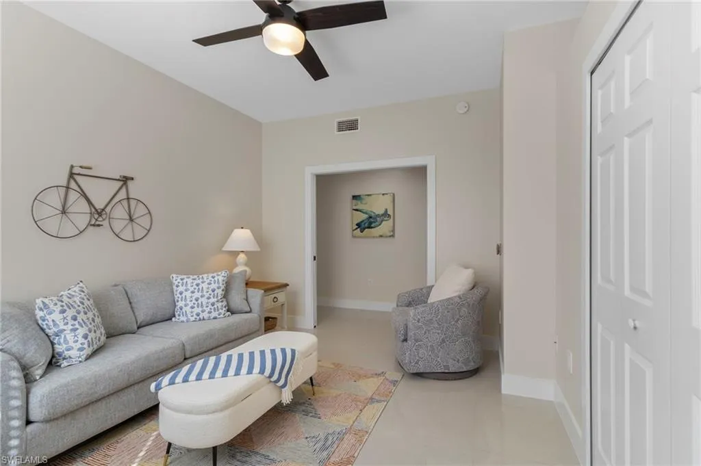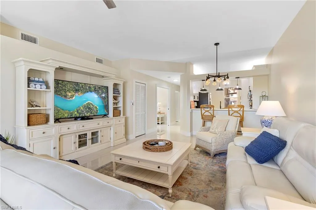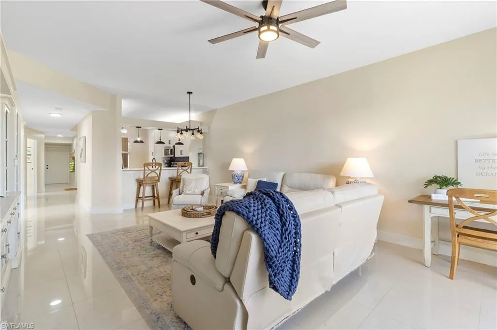 The open layout blends style and functionality, featuring 2 bedroom, 2 bathrooms, a spacious living room, bright modern kitchen with white cabinetry and full appliances, and a peaceful screened lanai perfect for morning coffee or sunset relaxation.