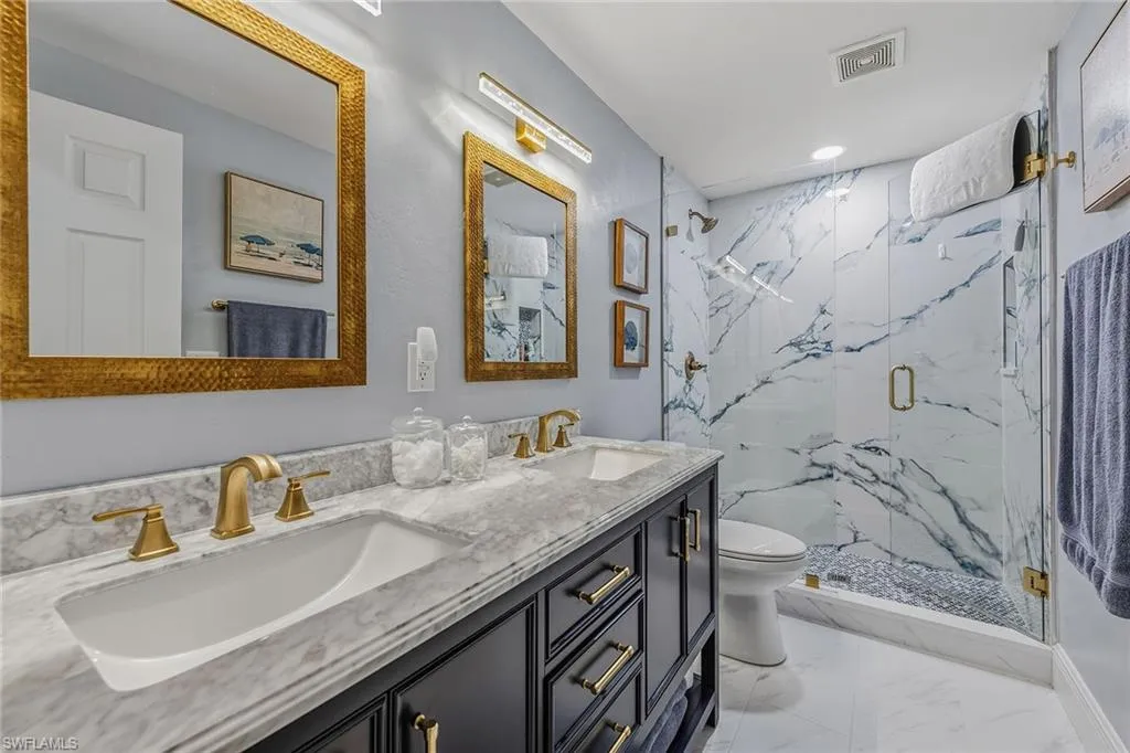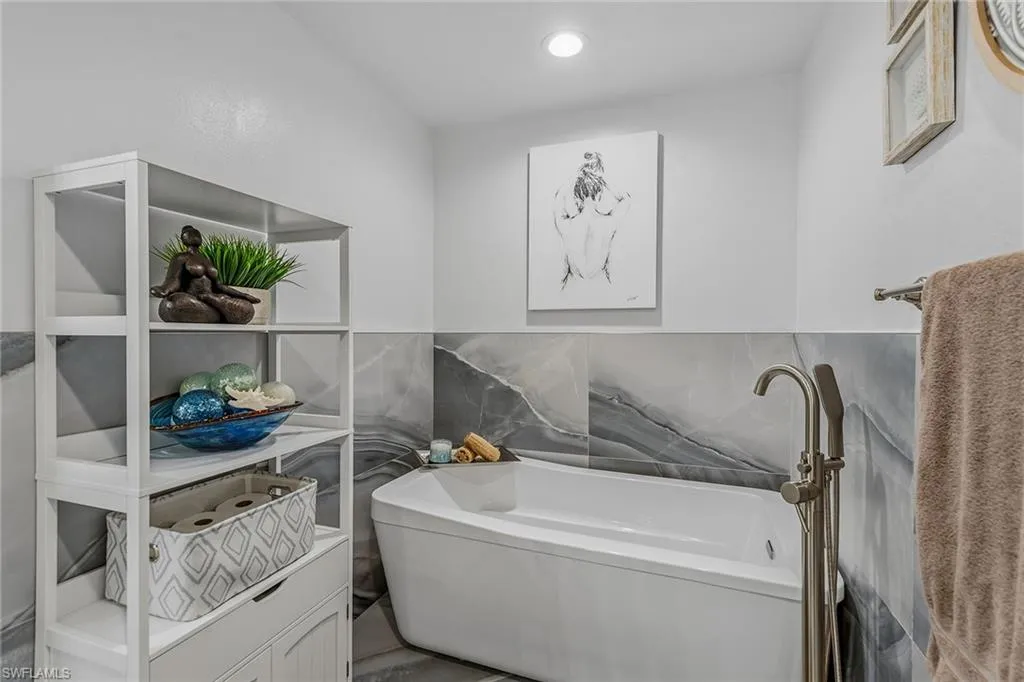 Set against a backdrop of lush fairways and manicured greens, this fully remodeled two-bedroom, two-bath, first-floor residence offers a refined retreat within the enclave of Eagle Creek Golf & Country Club. Every detail of the home has been thoughtfully reimagined, blending timeless materials with modern design for a move-in-ready living experience. An open floor plan welcomes you with warm-toned laminate flooring that extends throughout the residence, creating seamless transitions from room to room. The kitchen is a culinary centerpiece, featuring solid-wood cabinetry, stainless steel appliances, and quartz countertops that offer both function and aesthetic appeal. Generous counter space and a flowing layout make it ideal for everyday living and effortless entertaining. The primary suite is a sanctuary of calm, perfectly positioned to capture serene golf course views. A spacious walk-in closet and a luxurious, newly renovated bath complete this private haven. The guest suite is equally well-appointed, offering a spacious bedroom and a nearby remodeled bath, tucked away to ensure privacy for visitors. The true heart of the home is the oversized screened lanai—over 500 square feet of outdoor living space—perfectly suited for al fresco dining, lounging, or entertaining, framed by tranquil golf course views. Additional highlights include a private storage room, a detached one-car garage, one assigned parking space, and ample guest parking nearby. Stonegate residents enjoy their own private pool and spa, just steps from the residence, providing the perfect spot to unwind. The newly renovated Eagle Creek clubhouse beckons with championship golf, elevated dining, and a vibrant year-round social calendar. For those who prioritize wellness and leisure, the nearby Crystal Lake clubhouse offers outdoor dining, a fitness center, tennis and pickleball courts, and a resort-style pool framed by tropical landscaping. This residence is more than a home—it is a gateway to the coveted Naples lifestyle. Membership required.