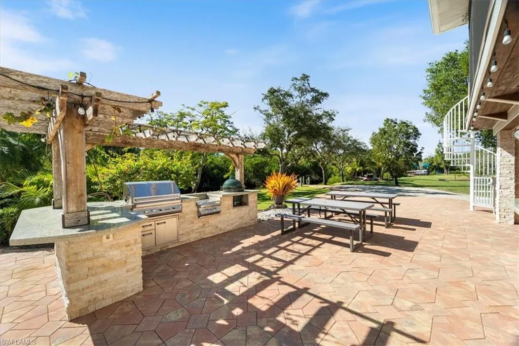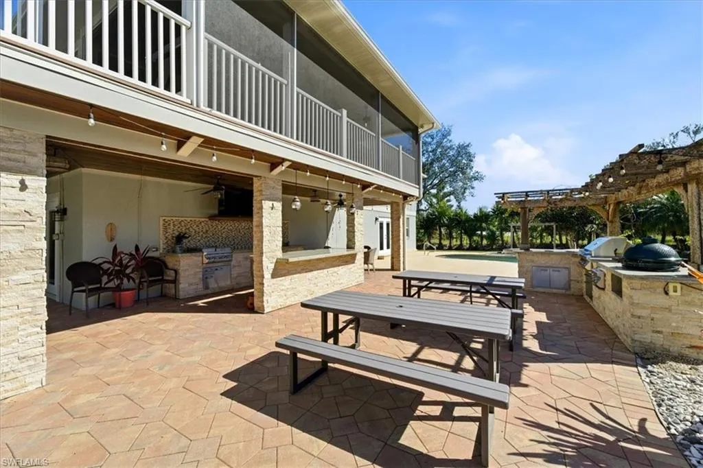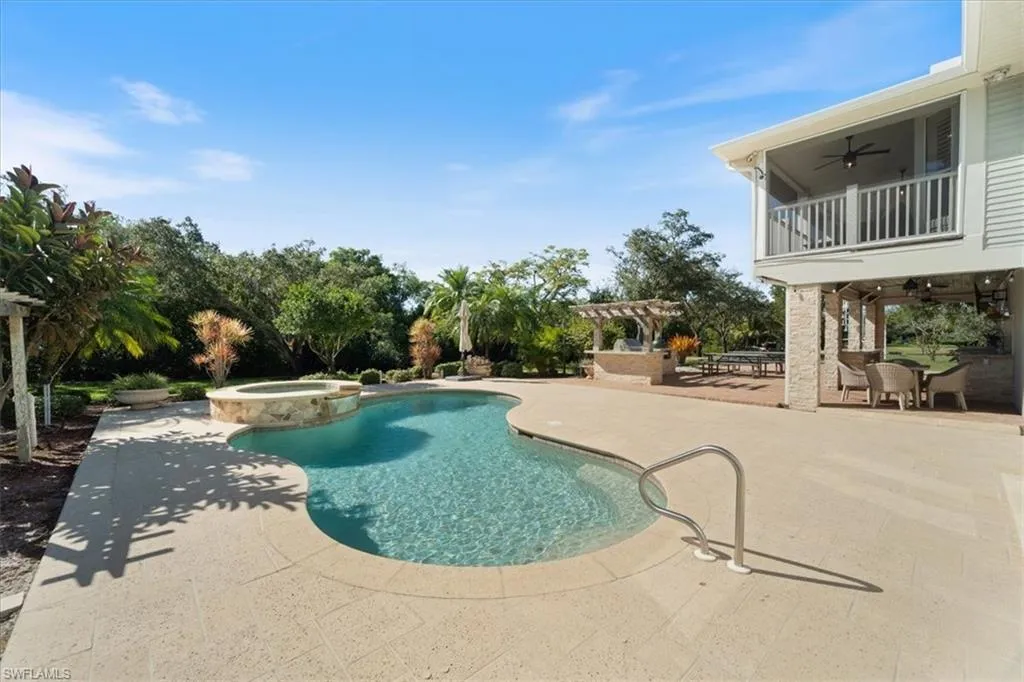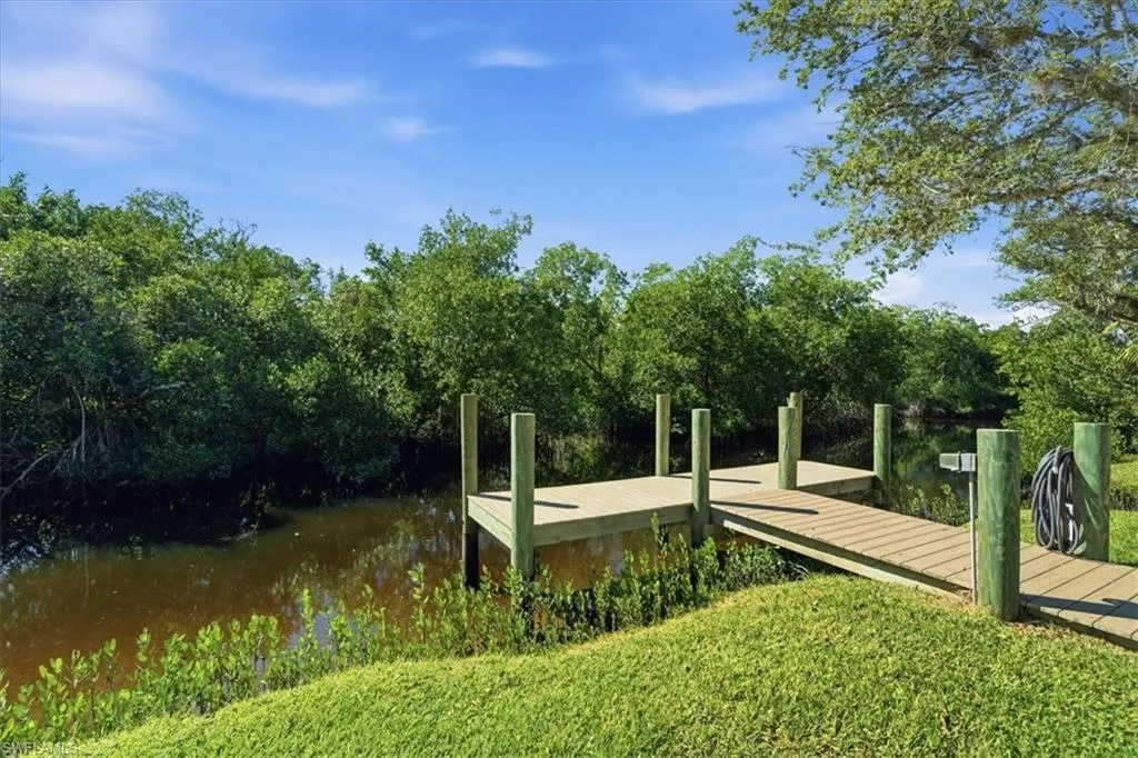 Welcome to your waterfront paradise where luxury meets convenience on over two acres of pure Florida living. This remarkable five-bedroom plus den residence offers the rare combination of direct Gulf access and sophisticated amenities that water enthusiasts dream about. The moment you arrive, the expansive concrete and paver driveway hints at the grandeur within. Step inside to discover soaring ceilings and gleaming hardwood floors throughout the upper level, creating an atmosphere of refined elegance. The gourmet kitchen stands as the heart of the home, featuring quartz countertops, shaker cabinets with crown molding, an expansive island, farmhouse sink, and premium stainless steel appliances including double ovens and wine fridge. Your aquatic adventures begin right at your doorstep with a private boat ramp and newly installed dock (Summer 2023). Within ten minutes of idling down Hendry Creek, you’ll reach the main waterway leading to endless Gulf exploration. The outdoor entertainment space rivals any resort, showcasing an impressive outdoor kitchen complete with cooktop, Big Green Egg cooker, and grill alongside a private pool, spa, and fire pit. The thoughtfully designed floor plan places a recreational room, two bedrooms, bathroom, den, gym, and laundry on the ground level, while the main living area, kitchen, dining room, primary suite, and two additional bedrooms occupy the upper floor. The primary bedroom features a walk-in closet with custom shelving, while the primary bathroom boasts dual sinks, an oversized tiled walk-in shower with multiple shower heads and soaking tub. Recent major improvements include a new metal roof (August 2023), septic system (December 2024), air conditioning with new ductwork and insulation (November 2024), plus an upstairs screened porch (2024). Hendry Creek offers additional amenities including a community boat dock, Gulf access, fishing pier, and tennis court, all with remarkably low association fees. This exceptional property delivers the ultimate Florida lifestyle where every day feels like vacation.