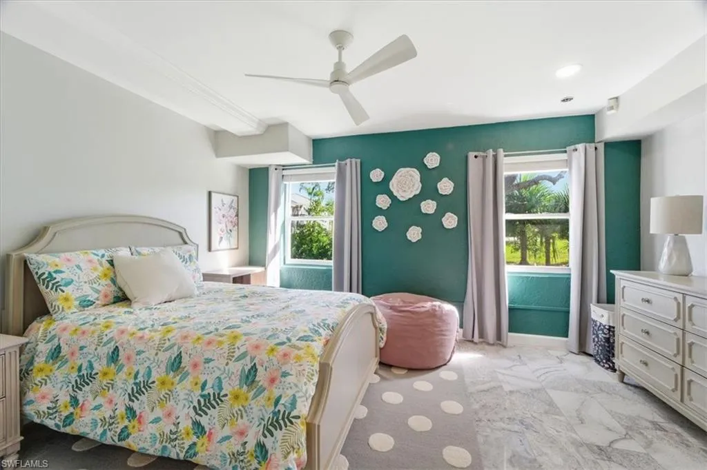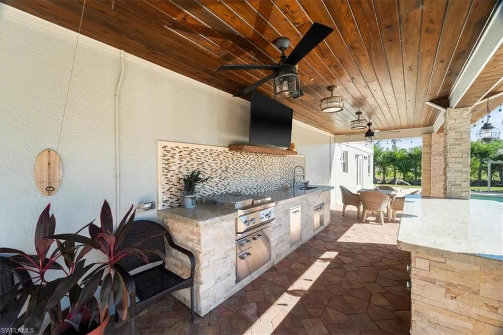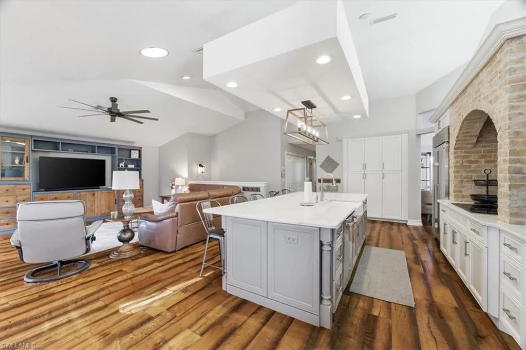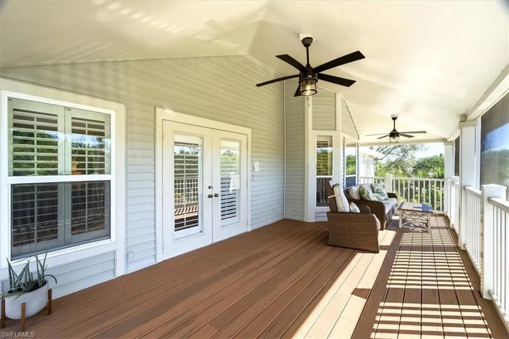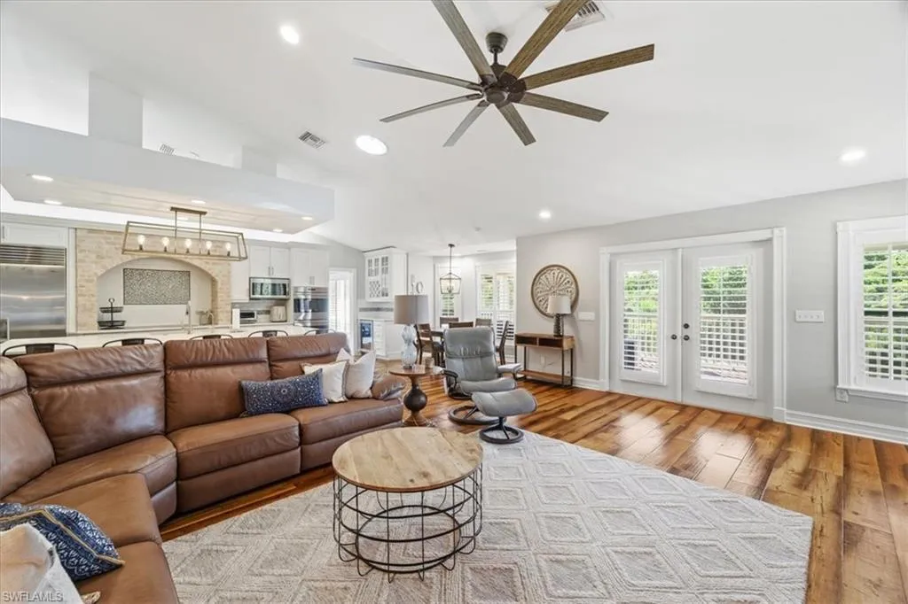 Welcome to your waterfront paradise where luxury meets convenience on over two acres of pure Florida living. This remarkable five-bedroom plus den residence offers the rare combination of direct Gulf access and sophisticated amenities that water enthusiasts dream about. The moment you arrive, the expansive concrete and paver driveway hints at the grandeur within. Step inside to discover soaring ceilings and gleaming hardwood floors throughout the upper level, creating an atmosphere of refined elegance. The gourmet kitchen stands as the heart of the home, featuring quartz countertops, shaker cabinets with crown molding, an expansive island, farmhouse sink, and premium stainless steel appliances including double ovens and wine fridge. Your aquatic adventures begin right at your doorstep with a private boat ramp and newly installed dock (Summer 2023). Within ten minutes of idling down Hendry Creek, you’ll reach the main waterway leading to endless Gulf exploration. The outdoor entertainment space rivals any resort, showcasing an impressive outdoor kitchen complete with cooktop, Big Green Egg cooker, and grill alongside a private pool, spa, and fire pit. The thoughtfully designed floor plan places a recreational room, two bedrooms, bathroom, den, gym, and laundry on the ground level, while the main living area, kitchen, dining room, primary suite, and two additional bedrooms occupy the upper floor. The primary bedroom features a walk-in closet with custom shelving, while the primary bathroom boasts dual sinks, an oversized tiled walk-in shower with multiple shower heads and soaking tub. Recent major improvements include a new metal roof (August 2023), septic system (December 2024), air conditioning with new ductwork and insulation (November 2024), plus an upstairs screened porch (2024). Hendry Creek offers additional amenities including a community boat dock, Gulf access, fishing pier, and tennis court, all with remarkably low association fees. This exceptional property delivers the ultimate Florida lifestyle where every day feels like vacation.
