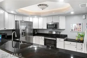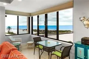 Enjoy beachfront living in this beautifully remodeled 2-bedroom, 2-bathroom condo on Fort Myers Beach. The entry to this condo is unique and versatile allowing for ample storage, a sitting area or even an office. This stunning open-concept home features a modern kitchen with trey ceilings, granite countertops and stainless steel appliances, perfect for entertaining. The split floor plan offers privacy and comfort, with a spacious guest room and a guest bath complete with a tub and shower combo. The master suite boasts tray ceilings, sliding doors for added privacy, and an ensuite bath with a walk-in shower. The living room has coffered ceiling design with added lighting along abundant natural light fills the space, showcasing breathtaking views of the beach and the Gulf of Mexico. Hurricane windows throughout provide added peace of mind. Don’t miss the opportunity to own this beachfront gem with spectacular views and stylish updates! This unit also has a brand new air conditioner which was installed March 2024.