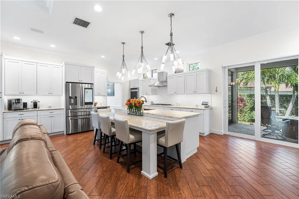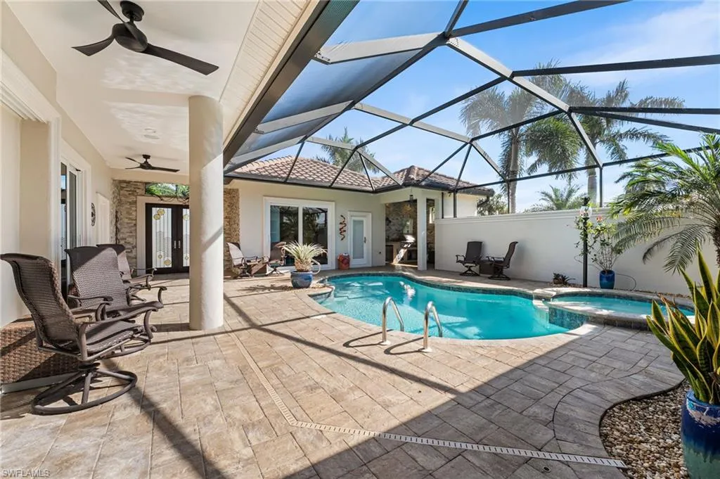Luxury meets privacy in this rare courtyard-style home in the prestigious, gated community of Edgewater inside Gulf Harbour Yacht & Country Club. From the moment you arrive, the stacked-stone front entryway opens into a stunning outdoor living courtyard, where the heated pool and spa are framed by an expansive paver patio and a full outdoor kitchen equipped with a Paradise Grill, refrigerator. The courtyard serves as the true heart of the home—offering a serene, private retreat that seamlessly connects the indoor and outdoor spaces.