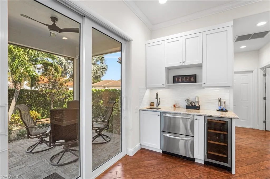 The chef’s kitchen features an upgraded KitchenAid appliance package, including a five-burner gas cooktop, abundant cabinetry, and a spacious peninsula that opens into the main living area—ideal for entertaining. A dedicated built-in office with Dekton countertops provides a quiet workspace with lake views, while the additional billiards/game room offers flexibility for recreation or hobbies and has serene views of the lake. Your formal dining area also offers lake views and a buffet cabinet with a wine cooler. Wine lovers will appreciate the three temperature-controlled wine chillers thoughtfully placed throughout the home.
