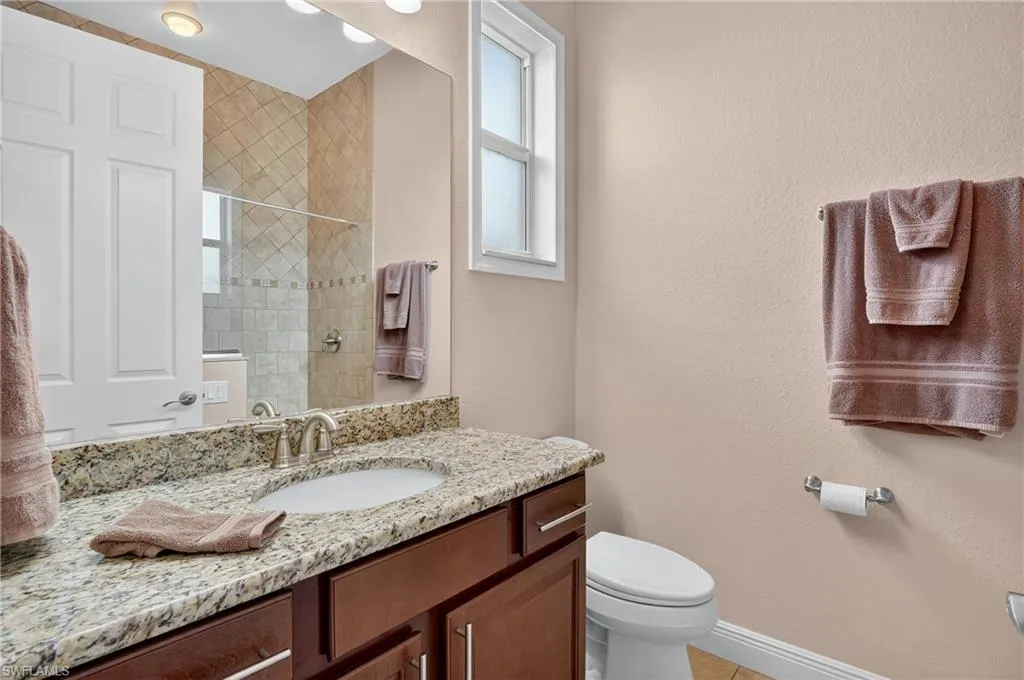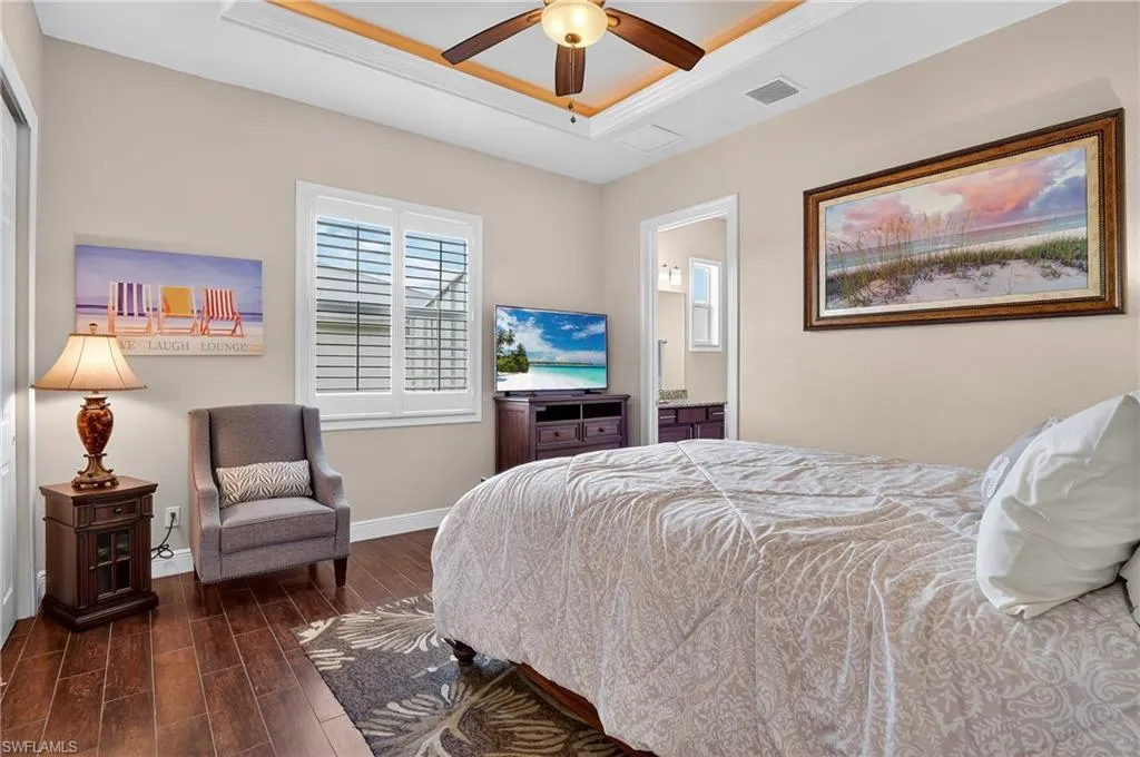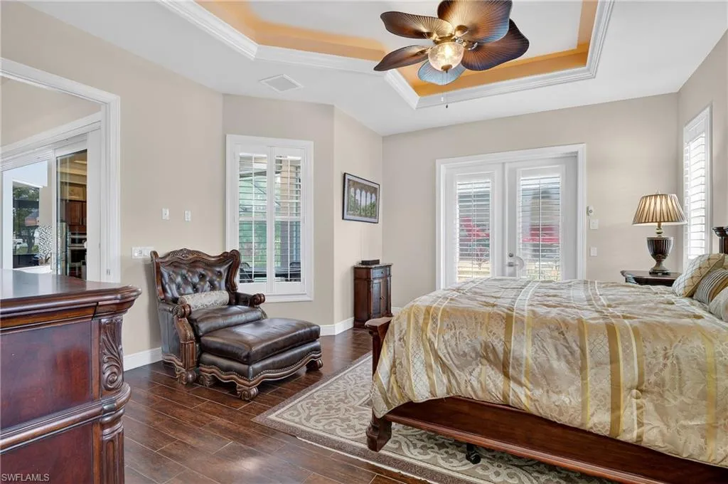 Elegant finishes, freshly painted interior & exterior, tasteful and current colors, including 2 private suites, plus a dedicated home office, a cathedral tray ceiling and wood flooring throughout. Massive 16′ sliding doors open to the screened, covered lanai with an outdoor kitchen—perfect for entertaining.