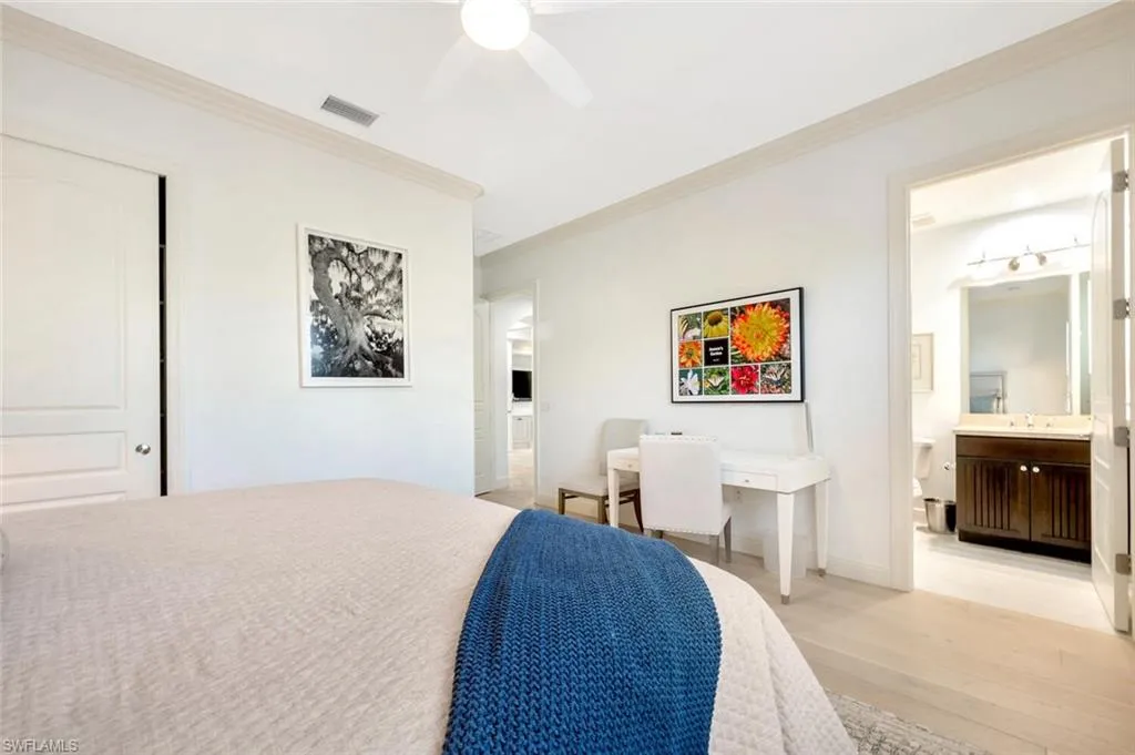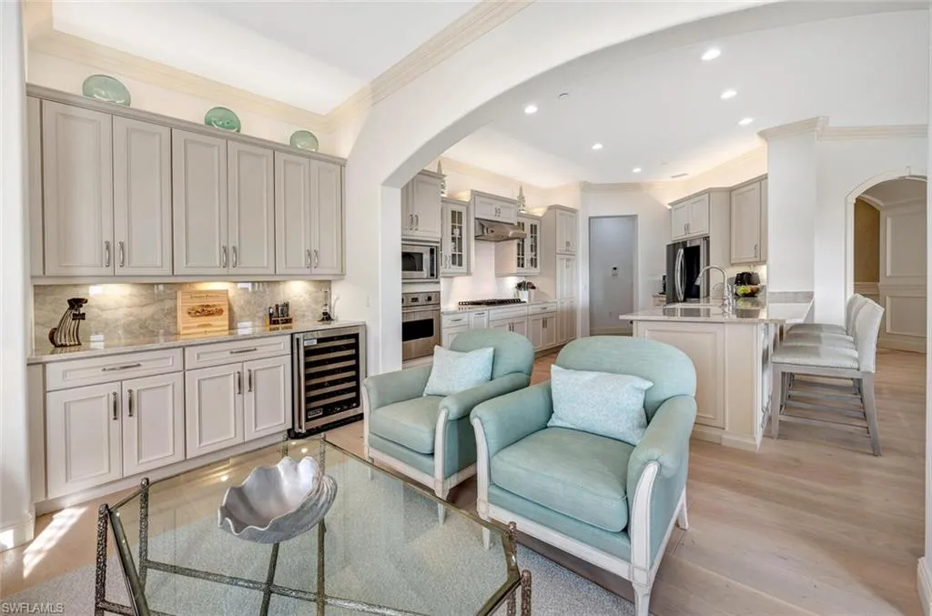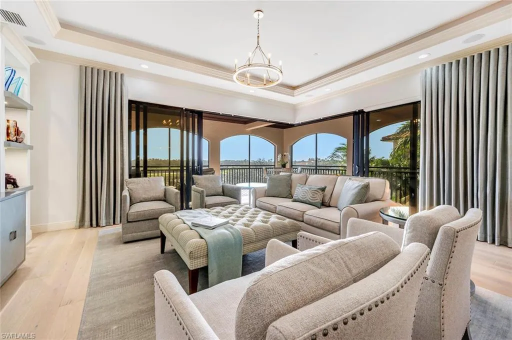 IMMEDIATE GOLF MEMBERSHIP AVAILABLE–Absolutely stunning, highly sought after & the largest available top floor remodeled Penthouse in the desirable Marquesa Royale. Just steps to the pool & the RITZ-Carlton Golf Resort in Tiburon. Expansive views of the 18th & 9th fairways, Lakes, water features & the Tiburon golf club & practice range in the distance. Perfect location for sunlight on your balconies both morning & afternoon.. Beautifully renovated to include Belle Ponds collection wood flooring, light kitchen cabinetry with glass doors & lighting both under & above the cabinets, special Perla Venata Quartzite countertops, contemporary lighting fixtures & fresh NEW light furnishings!! The beautiful modern furnishings are available also, if desired… This PH features: 10.6 ft ceilings throughout, Private & secure elevator access, all en-suite bedrooms, Den large enough for a 4th bedroom as it has a closet, built-in desk area, access to a private balcony & to the half bath. The upgrade list continues with 2 spacious screened balconies with Cedar ceiling detail & travertine flooring, Viking 6 burner natural gas cooking with commercial hood, top line stainless appliances, Plantation shutters, speaker system inside & outside, whole home water treatment system, tankless gas water heater, AIR SCRUBBER system for the NEWER AC, incredible trim detail on the doorways, walls & under counter, 2 garage parking spaces plus storage and Tiburon Golf & Social memberships are immediately available!. Medallion Golf membership is 80% REFUNDABLE and price increases January 1st, 2026 .. Details are available.