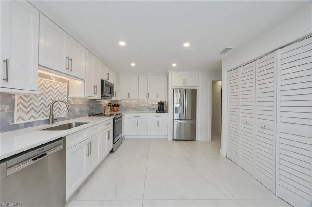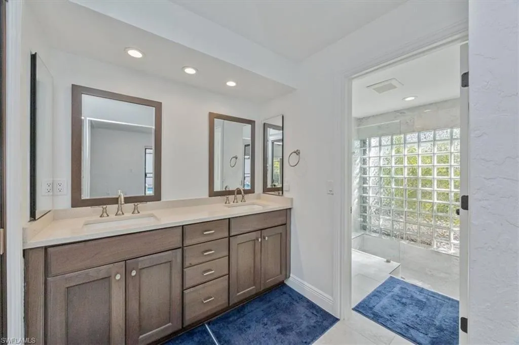 The dramatic sunken living room features cathedral ceilings, a cozy wood-burning fireplace, and walls of glass framing endless pool and lake views. The stunning kitchen boasts quartz countertops, soft-close shaker cabinetry, designer tile backsplash, new stainless appliances, accent lighting, and large pantry. Retreat to the spacious primary suite with brand-new carpeting, dual walk-in closets, and a spa-like ensuite showcasing an oversized sunken frameless-glass shower, mosaic tile flooring, and a block-glass privacy wall that floods the room with natural light. The guest bath and laundry room are equally reimagined with quartz vanities, custom cabinetry, high-end fixtures, a new LG washer and dryer, deep composite sink, and abundant storage.