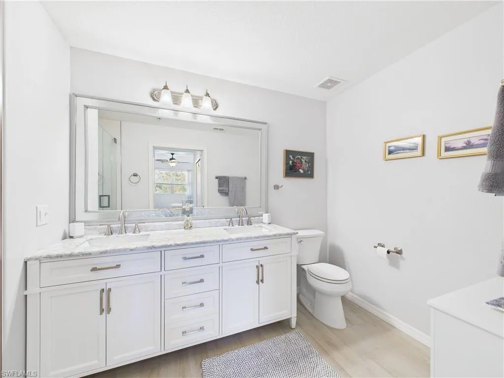 Beyond the main living area, the primary suite offers comfort and style with two, spacious walk-in closets and a beautifully updated bath featuring dual vanities, contemporary tile work, and a frameless glass walk-in shower. A second well-sized bedroom, positioned near the guest bath and its own hallway, functions perfectly as a second master-style suite, providing guests with added privacy. The third bedroom, enhanced with French doors, is ideal as a flexible guest room, office, creative space, or a combination of both.