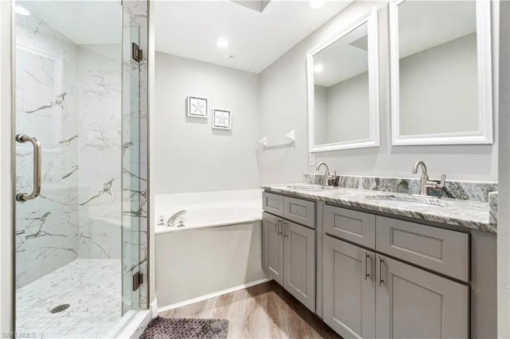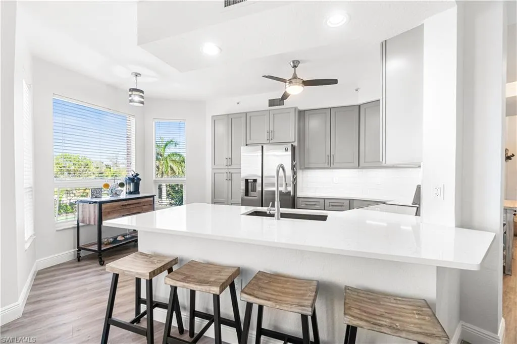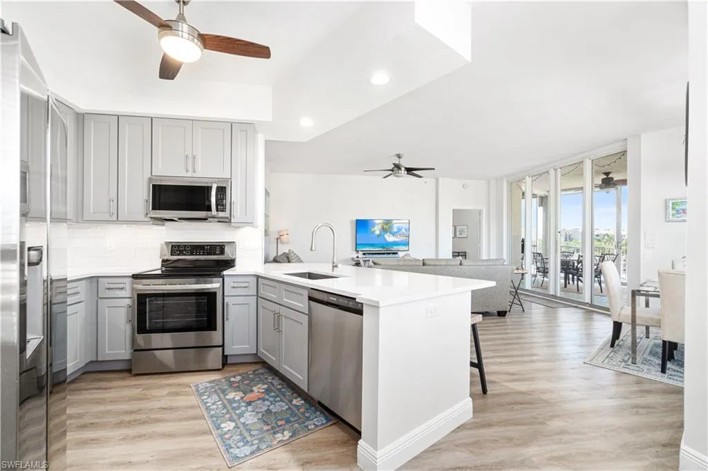 Beautifully renovated END-UNIT with spectacular bay views nestled on the peaceful South End of Estero Island! This 3 bed/2 bath coastal contemporary retreat is finely appointed with an open floor plan, new hot water heater, newer HVAC (2021), beautiful driftwood-inspired flooring, white and bright interior, and ample windows for gorgeous natural lighting. Perfectly situated less than half a mile from Fishtale Marina, where you can store your boat with ease, and the Freedom Boat Club, offering hassle-free boat rental memberships, this location caters to all your maritime desires. Additionally, enjoy the flexibility to own a boat slip or rent one at Palm Harbour Club as they become available. This condo is truly a beach and boater’s haven, providing unmatched convenience and access to the vibrant boating lifestyle you’ve always dreamed of. Palm Harbor Club allows for weekly rentals, creating a fantastic opportunity for potential rental income! Enjoy your morning coffee on the expansive lanai, taking in panoramic bay views and watching boats drift by. The screened lanai also offers glass sliders, providing the flexibility to be an enclosed sunroom or an open-air space inviting in the soothing sounds of the bay. The open-concept kitchen is perfect for entertaining and features elegant slate grey cabinetry, pristine white quartz countertops, stunning white tiled backsplash, and a new refrigerator and dishwasher. The well-designed split floor plan offers privacy and convenience, with guest bedrooms and bath situated at the front, while the serene primary suite is positioned on the waterfront side. The primary suite boasts direct lanai access, breathtaking bay views, and a luxurious bathroom with dual vanities, a soaking tub, and a spacious walk-in shower. Palm Harbor Club is the ideal spot for beach and boating enthusiasts, located just steps from Fort Myers Beach’s pristine sugar sands. Residents can also enjoy resort-style amenities such as a large pool, spa, clubhouse, and tennis/pickleball courts.