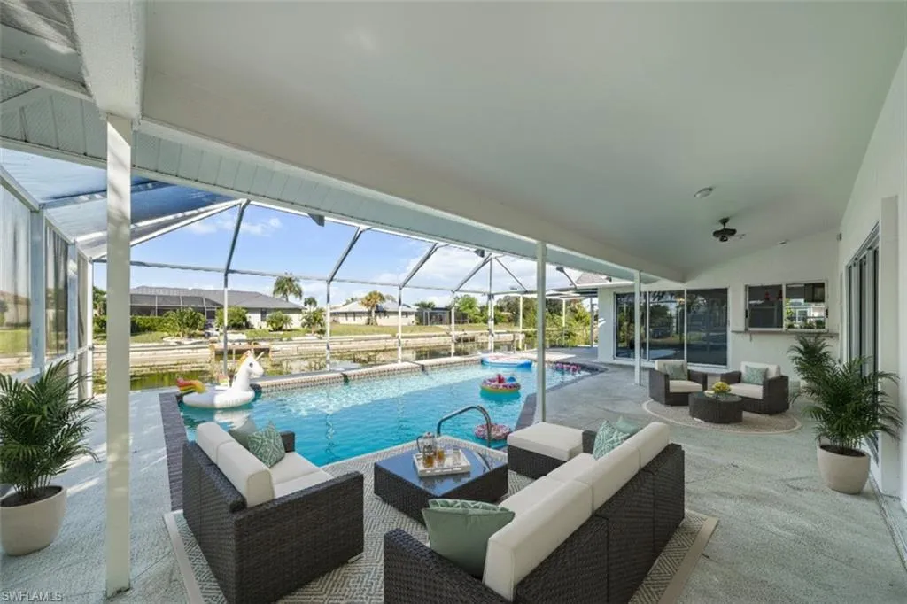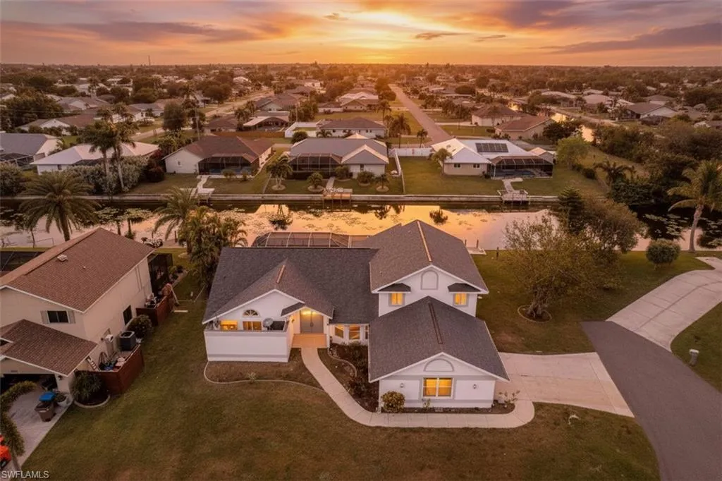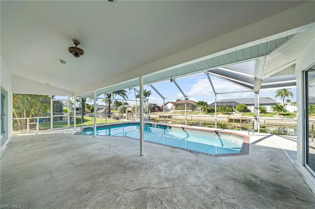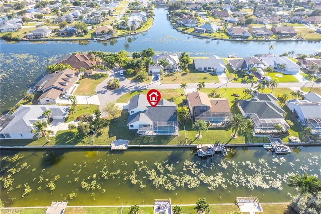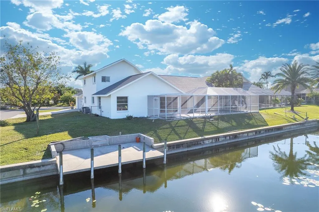Waterfront Home with Oversized cul-de-sac Lot in Shamrock Lakes! Located at the end of a quiet street in the desirable Shamrock Lakes neighborhood, this spacious waterfront home sits on an oversized, hammerhead-shaped lot, offering 120 feet of waterfront, whereas most nearby lots offer only 80 feet. With 2,956 square feet of living space and nearly 5,000 total square feet, this home offers room for everyone with 5 bedrooms and 3 full bathrooms, perfect for large families, multi-generational living, vacation rental, or flexible options such as a home office or fitness room. The home features a new roof, a fresh coat of exterior and interior paint, and incredible potential for the next owner to customize to their taste. All upstairs windows are hurricane impact. Inside, natural light fills every room, and multiple sets of triple sliding glass doors bring expansive views of the pool and water into the living spaces. The open kitchen offers abundant natural light and overlooks the dining and pool areas, creating the ideal layout for entertaining. A separate living room and family room. The Master Suite is extremely spacious and features cathedral ceilings, wood flooring, and peaceful water views. The master bathroom includes dual sinks, a walk-in shower, a jetted soaking tub, and a private atrium that brings in natural light. Guest bedrooms are generously sized, offering comfort for visiting family and friends. Live the Florida lifestyle in the expansive screened pool area with large, covered spaces for dining and relaxing by the water. A concrete dock and seawall offer additional outdoor living space, perfect for fishing, lounging, or launching a kayak or paddleboard. This freshwater canal system connects to miles of lakes and waterways for boating, fishing, kayaking, paddleboarding, jet skiing, and more. Ideally located near Hunters Run Executive Golf Course, Sun Splash Family Waterpark, and Cape Coral’s premier dining and shopping, this home is also close to major redevelopment projects including The Cove at 47th, Bimini Square, the reimagined Cape Coral Yacht Club, and Slipaway Marina, all bringing vibrant new life, waterfront dining, entertainment, and community amenities to the area. Come experience the beauty and serenity of waterfront living on Shamrock Lakes, where every sunset and breeze reminds you why Southwest Florida is paradise.