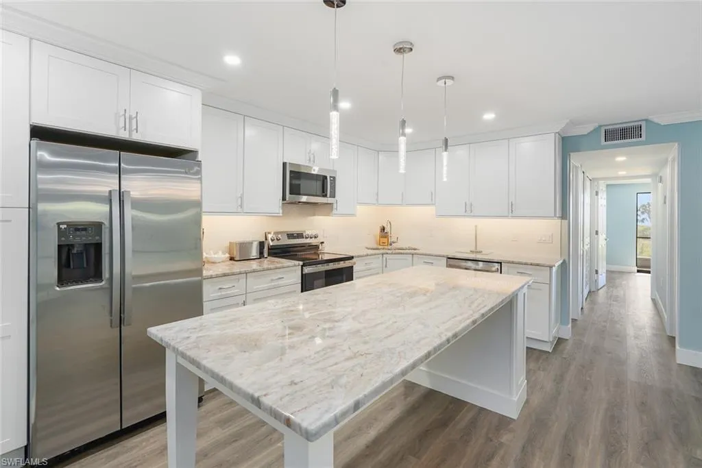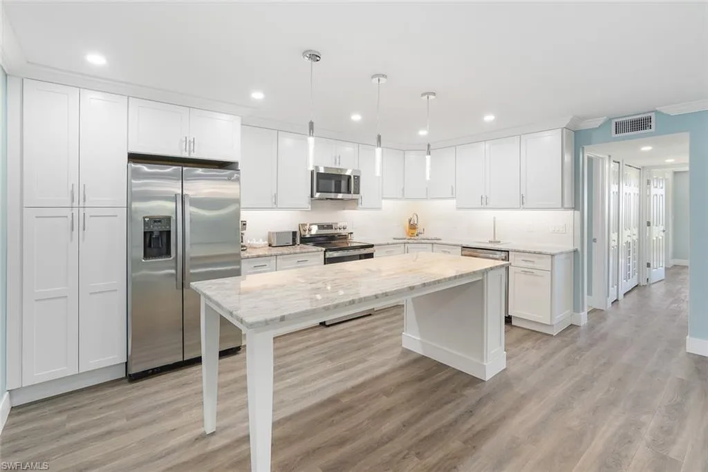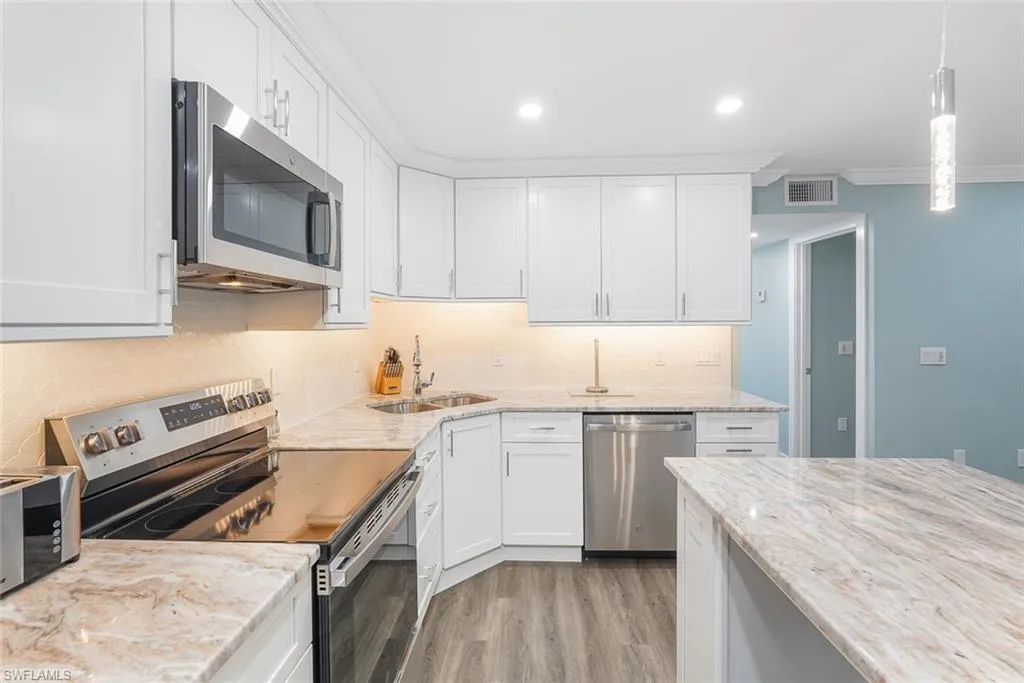 This first-floor unit has been completely remodeled with attention to detail throughout. The open-concept layout features new flooring, fresh coastal-inspired paint, updated interior doors, upgraded lighting, and refined craftsmanship that creates a bright, inviting atmosphere. The kitchen has been tastefully redesigned with new cabinetry, quartz countertops, stainless steel appliances, and a stylish tile backsplash, making meal preparation both functional and beautiful.