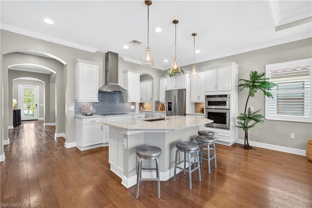 The expansive great room, framed by elegant tray ceilings and crown molding, is open to a designer kitchen curated for the discerning chef. Enjoy 42” premium cabinetry, stunning quartz countertops, an artfully tiled backsplash, and a large island accented by designer pendant lighting. A full suite of KitchenAid appliances — including a cooktop with exhaust hood — pairs beautifully with the Butler’s pantry, recessed lighting, and under-cabinet illumination to create a space that’s as functional as it is beautiful.