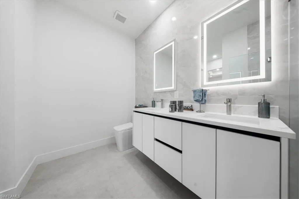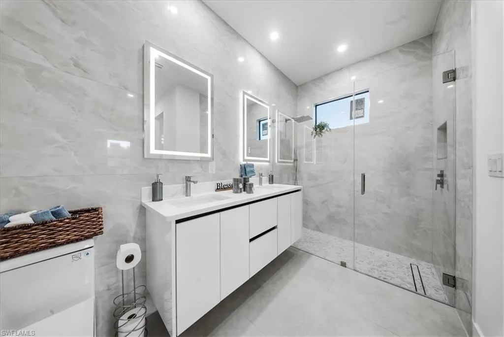 The kitchen is a centerpiece of the home—complete with a quartz waterfall island, stacked two-tone custom cabinetry, and full quartz surfaces throughout. Both bathrooms offer walk-in showers with glass doors, while the master includes a double vanity for added comfort.
