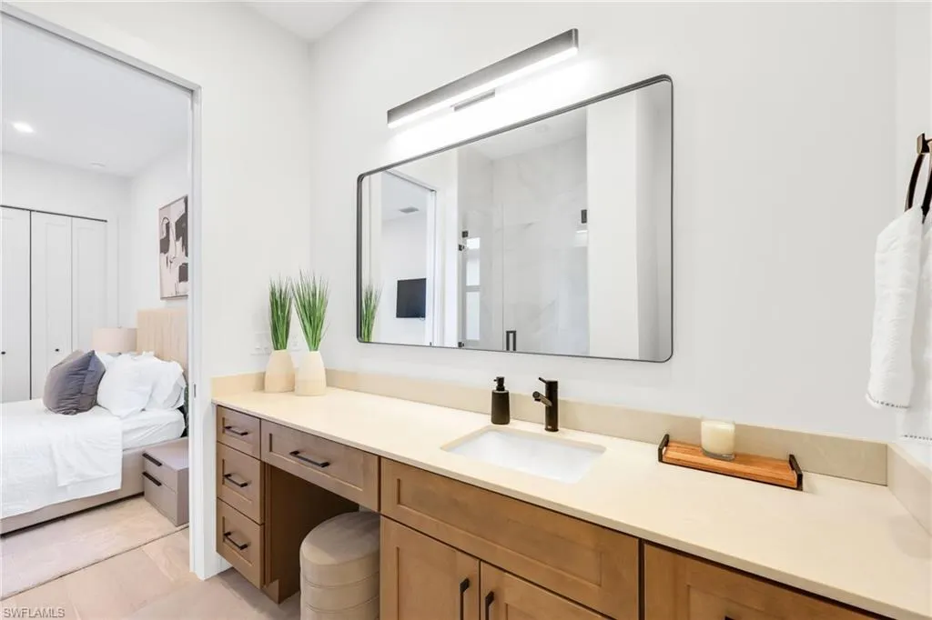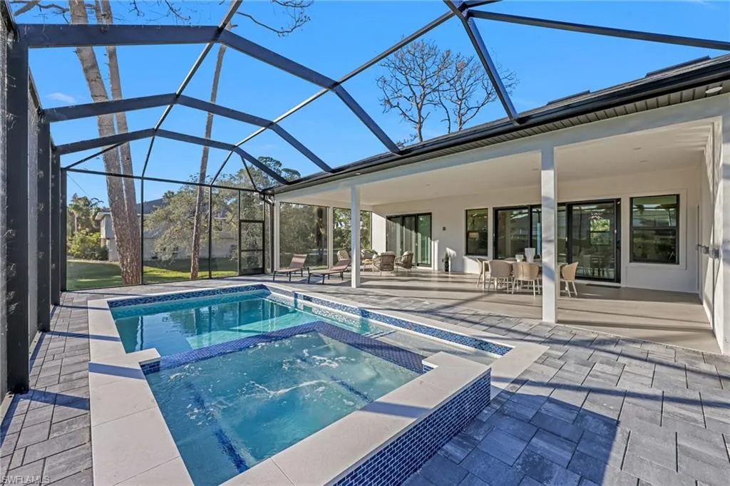 This NEW CONSTRUCTION pool home is Nestled mere moments from the sugar white sands of Bonita Beach, this impeccably reimagined coastal contemporary residence embodies refined luxury and serene sophistication. Built to the highest standards, the home greets you with soaring ceilings, wide-plank European Tile, and an abundance of natural light that dances across crisp architectural lines and curated modern art. The heart of the home is an open concept great room flowing seamlessly into a gourmet kitchen adorned with custom two-tone cabinetry, exquisite quartzite waterfall counters, and premium stainless appliances. A generous island with leathered-finish seating invites effortless entertaining, while expansive IMPACT RESISTANT glass doors frame tranquil pool and garden vistas, blurring the boundary between indoors and out. The primary suite is a private sanctuary of understated elegance: a voluminous bedroom with tray ceiling, a spa inspired bath featuring dual floating vanities, matte-black fixtures, an oversized frameless glass rain shower, and a freestanding sculptural tub. Three additional guest suites, with 2 en-suite baths finished in porcelain and natural stone, offer family or visitors the same level of thoughtful luxury. Every detail has been considered designer lighting, custom built-in millwork, a chic laundry suite with ample storage, and a spacious three car garage. Outside, the screened lanai and heated pool create a resort like escape, perfect for sunset cocktails or al-fresco dining under the palms. Located in one of Bonita Springs’ most coveted enclaves, this turnkey masterpiece places you steps from the Gulf’s turquoise waters, Fine dining with in minutes, and the vibrant energy of Bonita, Naples and Fort Myers all while offering the quiet privacy of a true coastal retreat. An exceptional offering for the discerning buyer seeking timeless design, impeccable craftsmanship, and the ultimate Southwest Florida lifestyle.