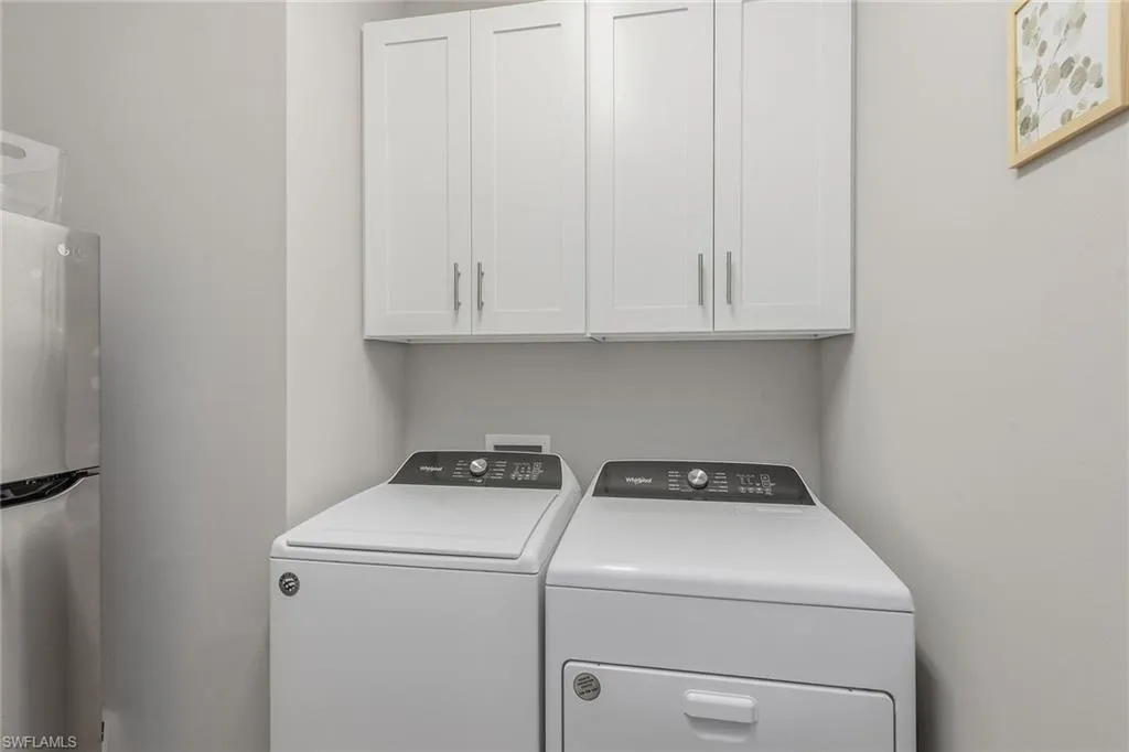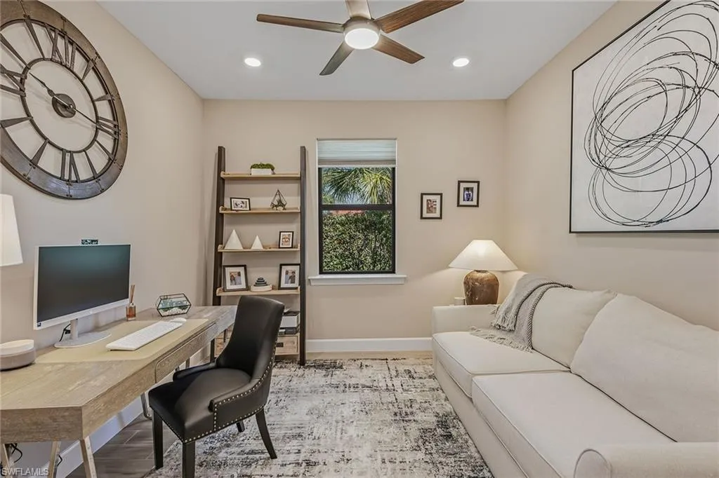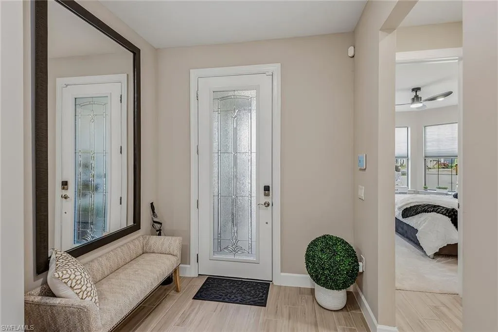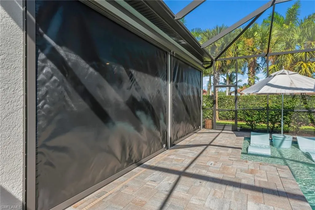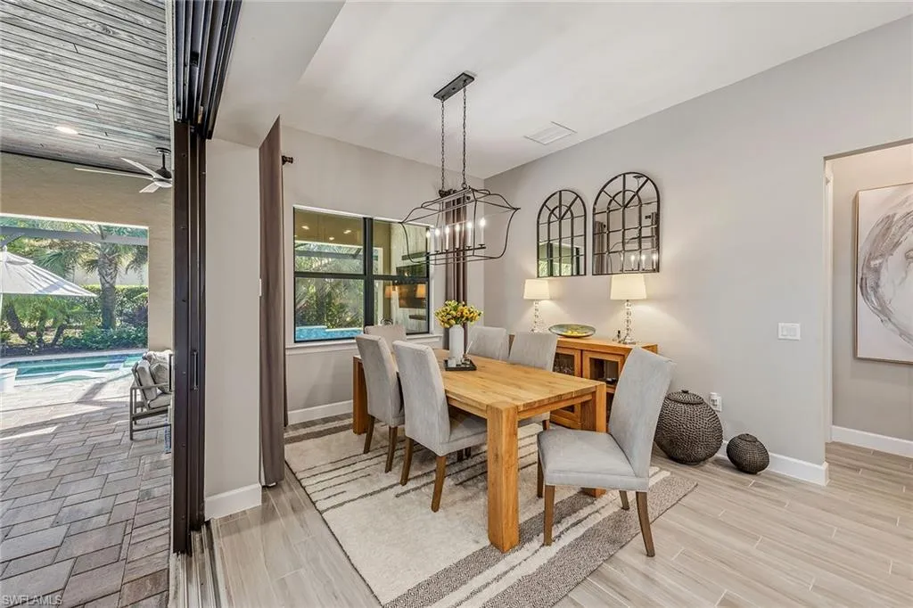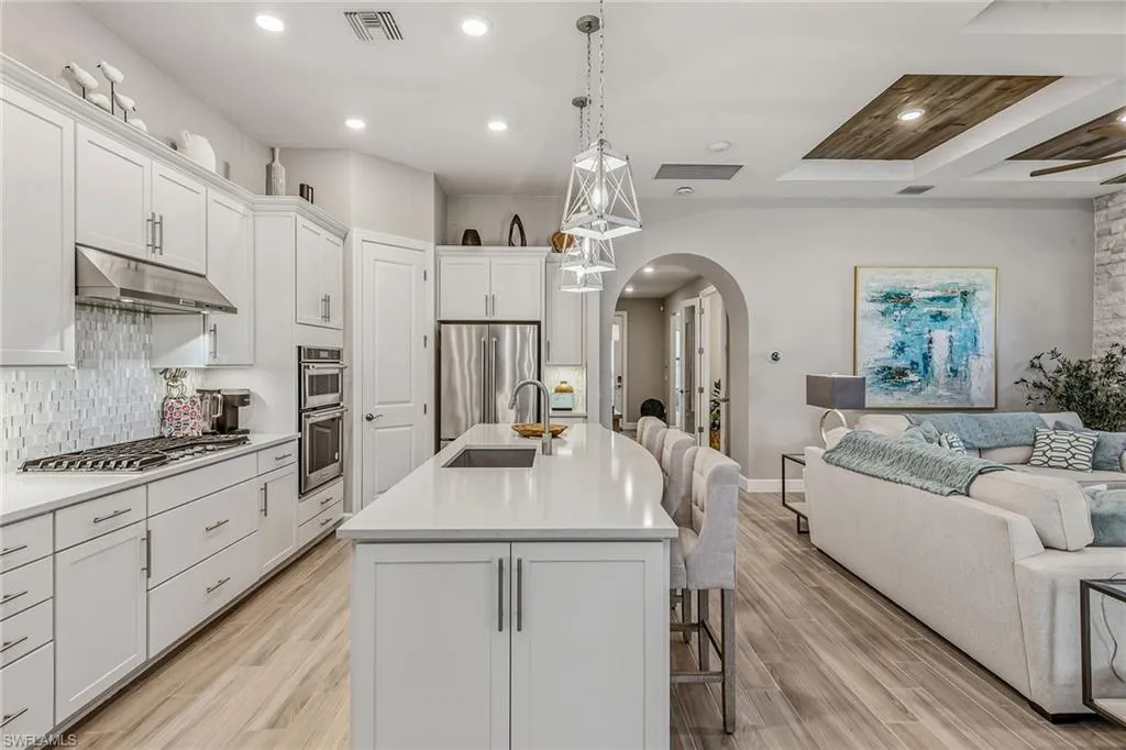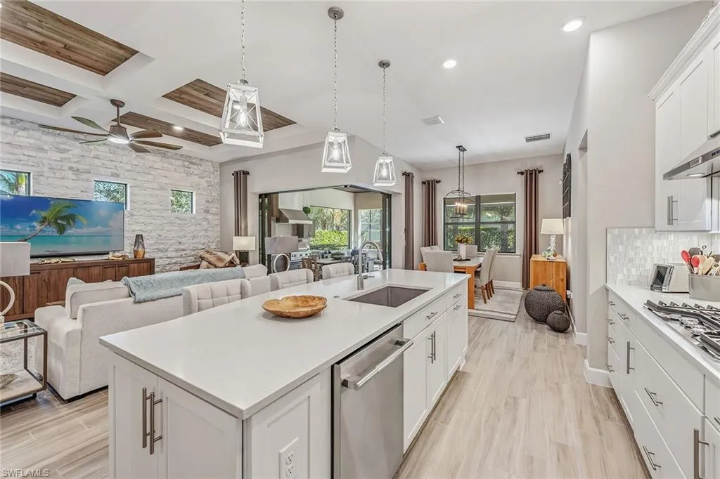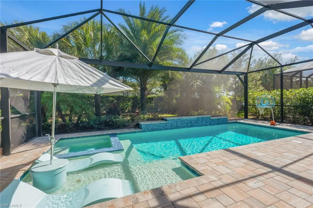 Experience luxury living in this beautifully furnished 2022 residence in Amaranda at Fiddler’s Creek, featuring an open floor plan and set on a desirable corner lot framed by private, lush tropical garden views. Designed to look and feel like a model home, this pristine three-bedroom plus den, three-bath retreat showcases an array of custom upgrades, modern finishes, and an effortless indoor-outdoor lifestyle.The exterior is surrounded by mature tropical palms and features a wide brick paver driveway, while full impact-resistant windows and sliders offer peace of mind year-round. A newer HVAC system adds comfort and efficiency. The expansive screened lanai with picture-window screening creates a seamless connection to the outdoors, complemented by a covered living area with ceiling fans and a stunning tongue-and-groove wood ceiling. A fully equipped summer kitchen with gas grill, hood, ceiling-height backsplash, sink, and mini fridge enhances outdoor entertaining, along with a built-in entertainment center featuring floor-to-ceiling tile and a fireplace. The heated pool and spa with waterfall feature and sun shelf are enveloped by lush landscaping, creating a private resort-inspired sanctuary. Inside, elegant tile flooring, recessed lighting, custom ceilings, and designer window treatments elevate every space. The chef’s kitchen impresses with white cabinetry, quartz countertops, a mosaic tile backsplash, a pendant-lit island with bar seating, and a spacious walk-in pantry with custom shelving. Newer premium KitchenAid stainless steel appliances include a five-burner gas range with hood, built-in microwave, wall oven, dishwasher, and French-door refrigerator. The kitchen flows into the formal dining area, framed by windows that highlight serene garden views, while the great room showcases a dramatic stacked-stone feature wall, coffered ceilings, and zero-corner sliding doors that fully open to the lanai. The owner’s suite is a luxurious haven with tray ceilings, custom lighting, and pocket doors leading to a spa-inspired bath featuring a quartz dual-sink vanity with full-width mirror, an expansive walk-in shower with bench, niche, floor-to-ceiling tile, and multiple showerheads, along with a walk-in closet outfitted with custom built-ins. Two generous guest suites offer comfort and privacy, each with its own en-suite bath featuring a tub-shower combo with glass enclosure. A private den with French doors and a modern fan serves perfectly as an office or study. Additional highlights include a well-designed laundry room with built-in cabinetry and Whirlpool washer and dryer, plus an exceptional garage with epoxy flooring, extensive cabinetry, a large counter workspace, and a tile backsplash. Residents enjoy a renovated 54,000-square-foot Club & Spa, resort pools, dining, fitness, and racquet sports, with optional golf, beach, and boating. Minutes from Marco Island and downtown Naples, the location offers true resort-style living.
