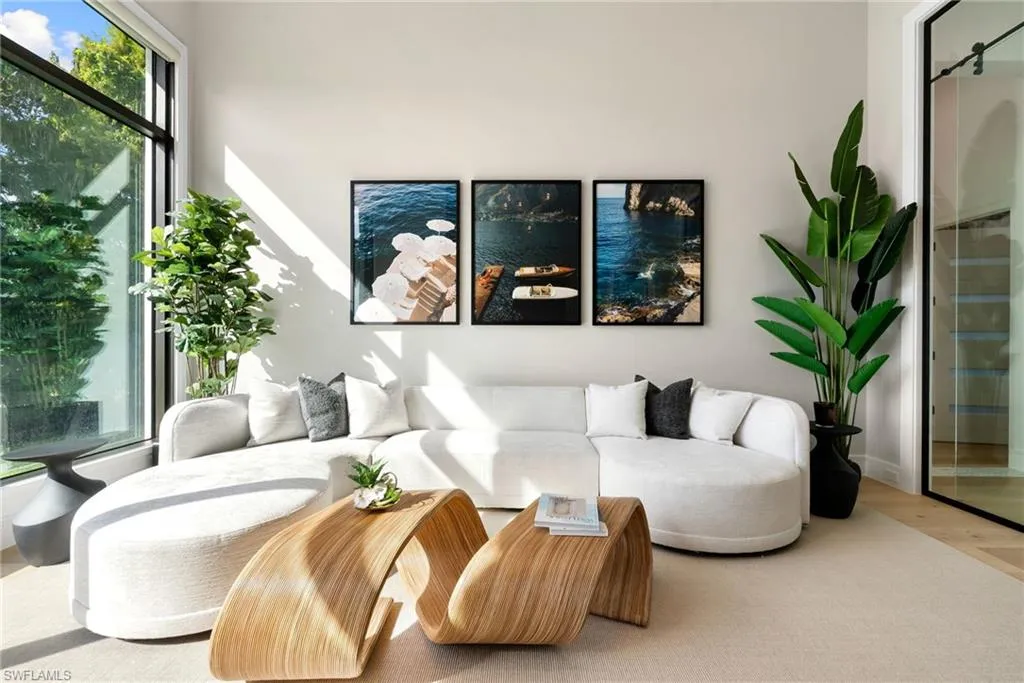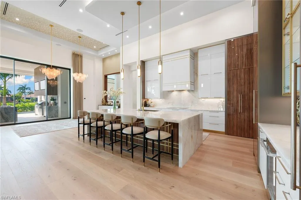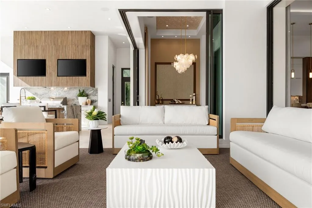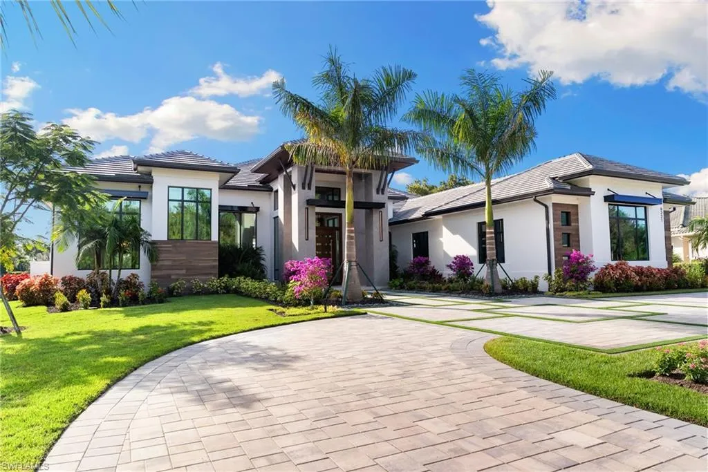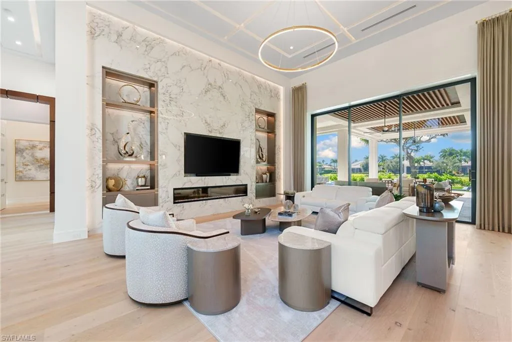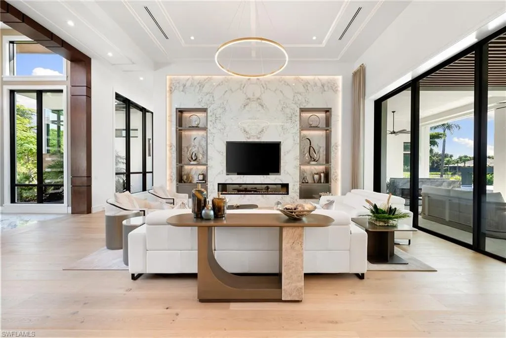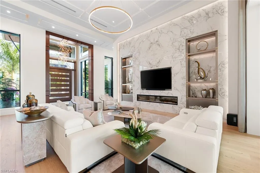 Enjoy tranquil modern elegance within this NEWLY CONSTRUCTED and custom-curated estate with IMMEDIATE GOLF MEMBERSHIP-INCLUDED! PLUS Water Views! This exceptional Estate Home has a FULLY FURNISHED interior and a luxury design package which includes carefully selected furnishings and decor for today’s sophisticated modern trends. Perfectly situated within one of Naples most prestigious communities of Quail West Golf and Country Club, a golfers paradise. This Waterfront property has gorgeous Southwestern sunset views and an inviting outdoor lanai with a unique pool/spa design, fabulous for hosting. This property is meticulously designed with a modern coastal atmosphere and exceptional luxury details throughout. Includes premium finishes of large format porcelain accent walls, unique premium glass modern cabinetry, premium signature quartzite countertops, modern appliances, creative flooring, premium light fixtures and accent illumination making this a truly dramatic home to enjoy for relaxing or entertaining. High ceilings of 12-19 ft throughout with floor to ceiling windows accentuating views from the front and rear elevations, which embodies the truly creative architectural features. The oversized garage will accommodate four vehicles plus a golf cart and storage area.