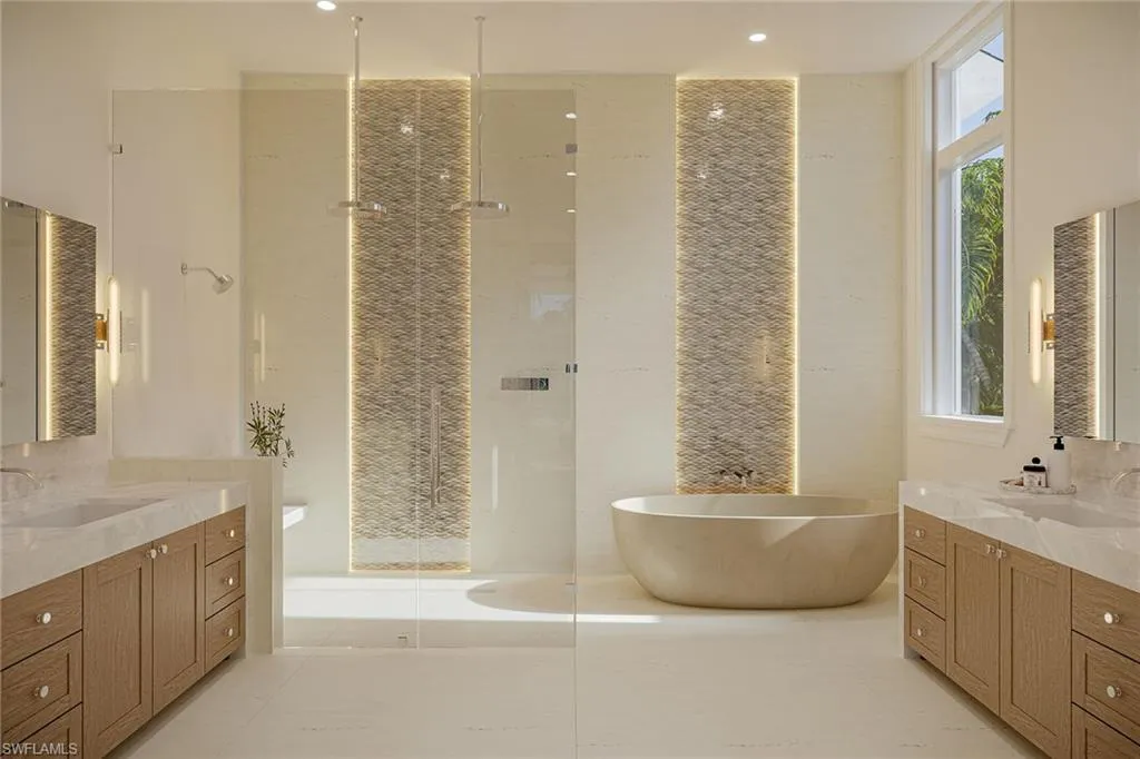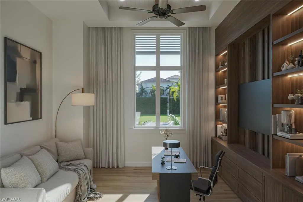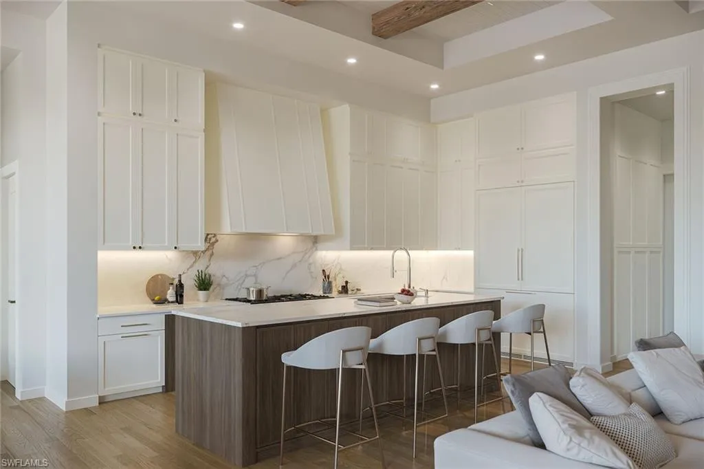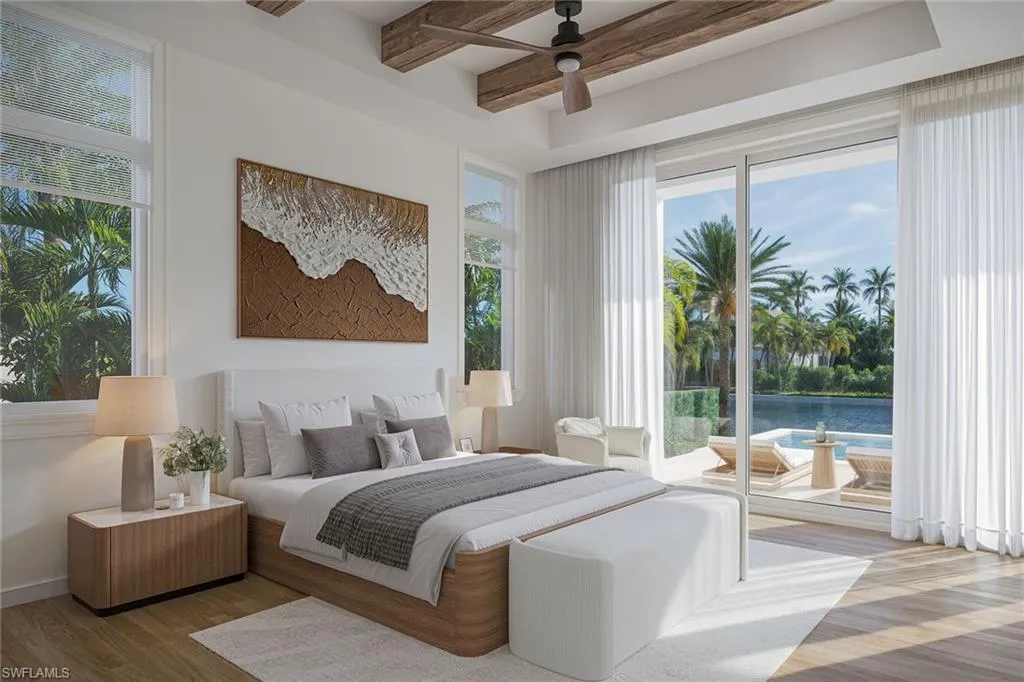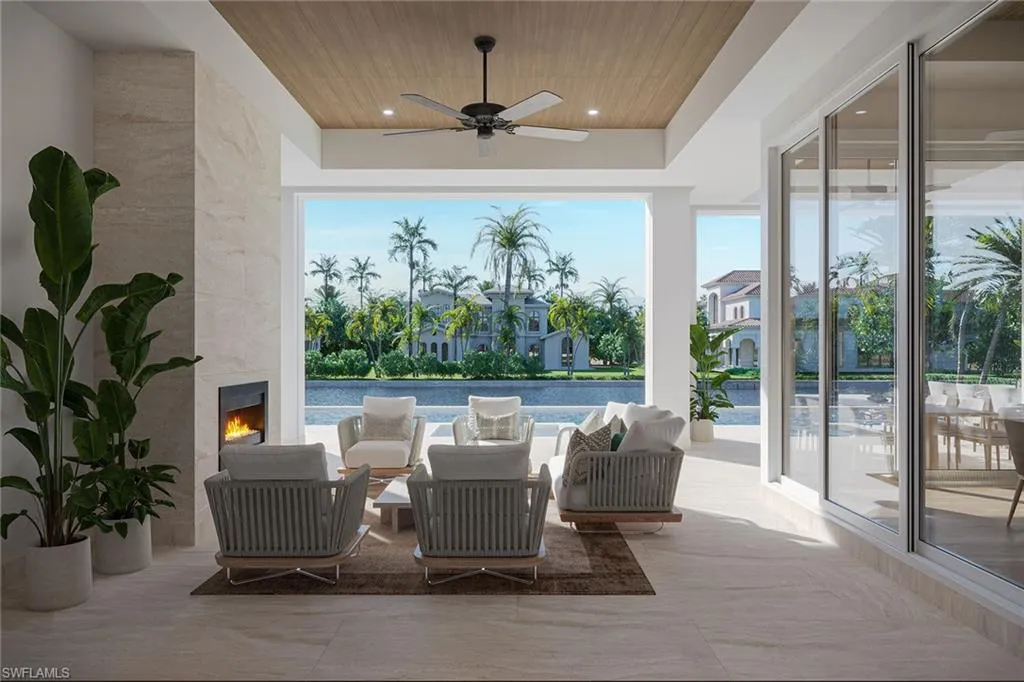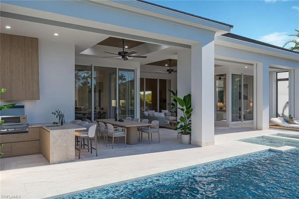 Experience coastal luxury at its finest in this impeccably crafted, southern-exposure waterfront masterpiece, built to the newest 10-foot base flood elevation. Positioned on a deep-water canal with direct Gulf access, this new residence pairs exceptional construction quality with an unbeatable Naples location, near Naples Bay Resort, Bayfront, Tin City and world-renowned 5th Avenue South. Naples iconic white sand beaches are only minutes away, offering the ultimate blend of convenience, lifestyle and waterfront living. Designed for modern living and effortless entertaining, this home features five bedrooms plus a den, 5.5 baths, a two-car tall garage with the ability to add lifts for four-car capacity, and 3,482 square feet of refined interior space. Designer-selected finishes and meticulous craftsmanship elevate every corner of the home. A custom tall mahogany front door opens to 12-foot ceilings, architectural ceiling treatments and European wide-plank oak floors that frame expansive water views. The great room showcases a dramatic cathedral ceiling, custom built-ins and a vapor fireplace wrapped in full marble. The chef-inspired kitchen centers around an oversized island with Taj Mahal quartzite countertops and is equipped with premier panel-ready appliances, including a 48-inch Wolf Dual Fuel Range, Sub-Zero Designer Column refrigerator/freezer, Cove dishwasher and Sub-Zero 24-inch wine and beverage coolers. The primary suite offers a serene waterfront retreat with dual custom wardrobe closets and a spa-like bath featuring natural stone finishes, a soaking tub and an oversized multi-head shower. Each guest suite includes its beautifully curated en-suite bath with custom cabinetry and natural stone selections. Seamless indoor-outdoor living is achieved through nearly 800 square feet of covered outdoor space complete with a summer kitchen, fireplace and panoramic water views, ideal for year-round alfresco living. The expansive pool deck includes over 1,200 square feet of space with a heated lap pool and spa, natural stone waterline tile, dual waterfalls and shell stone pavers. State-of-the-art technology enhances the entire home, featuring a Lutron automation system and wiring for security and motorized shades. The outdoor living area is fully protected by remote-controlled drop-down screens and storm shutters, and whole-house generator, ensuring comfort and peace of mind. Every inch of this newly built residence has been thoughtfully designed for luxury, comfort and sophistication. Scheduled for completion in January 2026, this home presents a rare opportunity to own a new, designer-finished waterfront property in one of Naples desired locations.