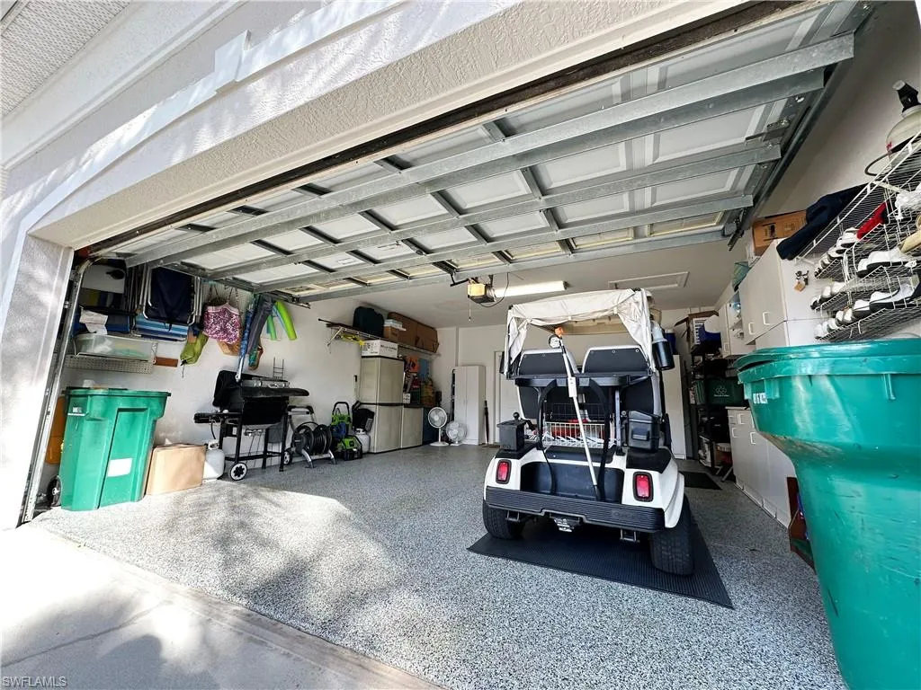 Retreat to the master suite with a king-size adjustable bed, remote control system, and an updated bathroom featuring frameless shower walls and elegant tilework. A two-car garage provides custom flooring, storage cabinets, and room for your personal golf cart.