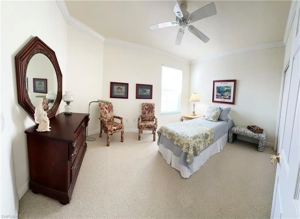 The spacious lanai overlooks the 12th hole of the golf course and is protected by electric roll-down hurricane shutters rated for winds up to 170 mph—ideal for enjoying Florida’s beauty with peace of mind. The chef-inspired kitchen showcases stainless steel GE Profile appliances, including a double-oven range, quiet dishwasher, and double-door refrigerator with freezer drawer. The raised high-top island offers built-in trash/recycle bins and ample storage.