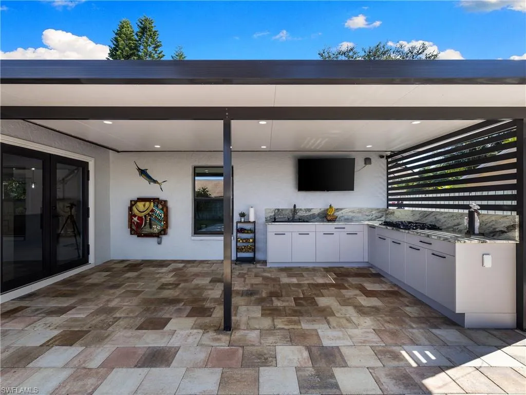 Inside, a few features are: Impact windows & doors, professional custom finishes throughout, including high-gloss cabinetry, quartz countertops, ALL closets/storage custom built in, recessed lighting, electric heated fireplace, bar area, wine fridge, large tile flooring, modern lighting fixtures, blackout window treatments on all windows, and smart home touches, outdoor kitchen, wired in security camera system and a converted garage adds exceptional versatility functioning as a 4th bedroom with walk-in closet or a home office/gym/playroom, in addition to the oversized laundry room with tons of space and storage. All appliances seen are included.