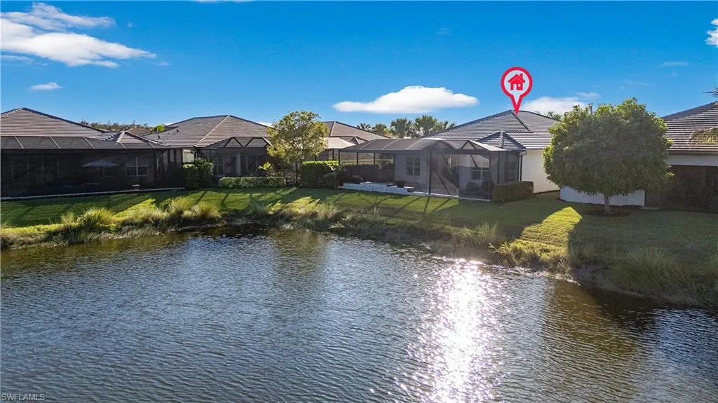 Experience elegant living in this beautifully appointed, rarely available Julia model situated on a premium lakefront lot in the highly sought-after community of Valencia Bonita. This spacious 2,878 sq. ft. residence offers three bedrooms plus a den, three and a half baths, and a three-car garage, being sold with furnishings negotiable for a seamless transition. Thoughtfully designed for comfort and style, the home features impact-resistant windows and doors, a glass-front entry door, tile flooring throughout the main living areas, and newly carpeted bedrooms. The open-concept layout creates an inviting atmosphere with a generous living room, formal dining space, and a beautifully upgraded gourmet kitchen ideal for both everyday living and entertaining. The kitchen is a true highlight, offering natural gas cooking, granite countertops, abundant cabinetry, stainless steel appliances, an extended tiled glass backsplash, and both under-cabinet and over-cabinet lighting. A spacious eat-in breakfast area adds convenience and warmth to the heart of the home. The owner’s suite is a serene retreat, complete with two walk-in closets, a large bedroom with tranquil views, an upgraded bath featuring tile finishes, dual vanities, and a walk-in shower. Outdoor living is elevated by a custom-built saltwater pool with a waterfall feature, sun shelf with bubbler, and a full picture-window pool cage that showcases pristine lake views. The extended lanai offers upgraded travertine stone flooring and a ceiling fan, creating an exceptional setting for relaxing or entertaining while enjoying the peaceful water backdrop. Additional interior enhancements include plantation shutters throughout, diagonal tile installed in the main living area, high-hat lighting, a guest bedroom with its own private en-suite bath, and custom cabinetry added to the laundry room. Residents of Valencia Bonita enjoy access to an unmatched 55+ resort lifestyle with a clubhouse, dining, fitness center, tennis, pickleball, and a full calendar of social activities. This exceptional home combines luxury finishes, an ideal open-concept design, and a premium lakefront setting to deliver the essence of effortless Florida living. This is your chance to begin enjoying the best of Valencia Bonita immediately.