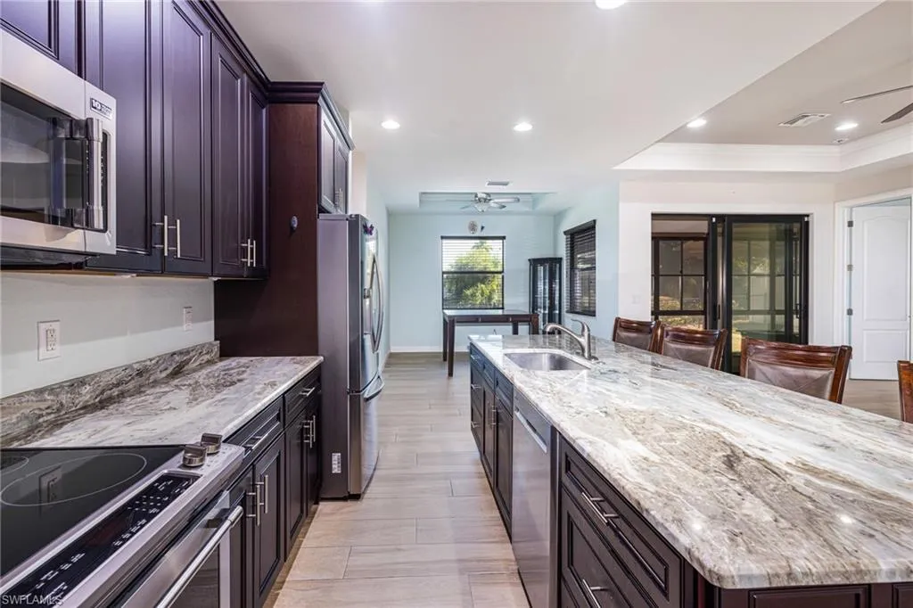 Step outside, where tranquility and adventure meet. Lounge in your screened patio, unwind on the paved waterfront deck, or escape to the water from your private dock. Set out on an effortless adventure, whether it’ a sunset cruise to Downtown Bonita for dinner and music or a straight shot to the Gulf for fishing, shelling, and exploring.
