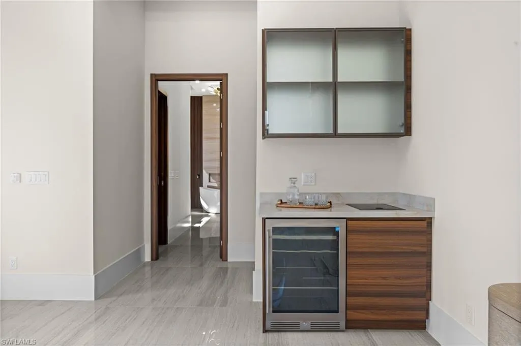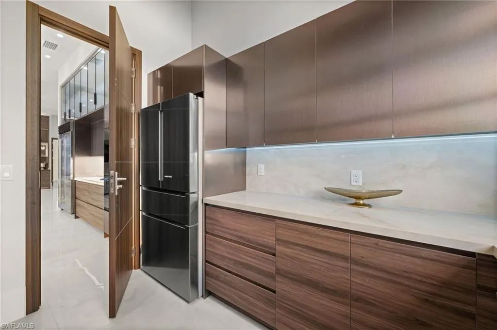 Every detail reflects an unwavering commitment to quality. The kitchen is outfitted with elite appliances such as a Wolf range, Sub-Zero and Cove refrigeration, and Bosch systems, all complemented by stunning Crystallo Quartzite waterfall countertops. Throughout the home and outdoor living spaces, the builder has crafted custom handmade inverted masterpiece ceilings, beautifully accented with both uplighting and downlighting to create a dramatic, high-end ambiance.A private poolside casita (548 Sq ft) offering an additional full kitchen, living room, bedroom, and bathroom—an ideal retreat for guests or extnded family seeking complete independence.