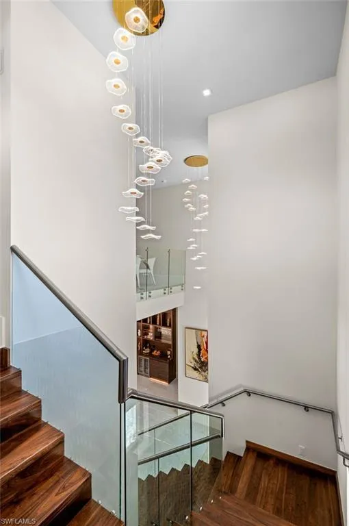 The interior exudes luxury at every turn, showcasing two expansive living areas, a dedicated office, and a striking glass staircase. Soaring 12.5-foot ceilings enhance the main living spaces, while a breathtaking 25-foot ceiling in the grand foyer makes an unforgettable first impression. Contemporary water vapor fireplace provides the visual sophistication of traditional fireplaces while offering a serene, maintenance-free experience indoors and outdoors.