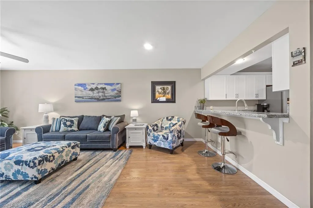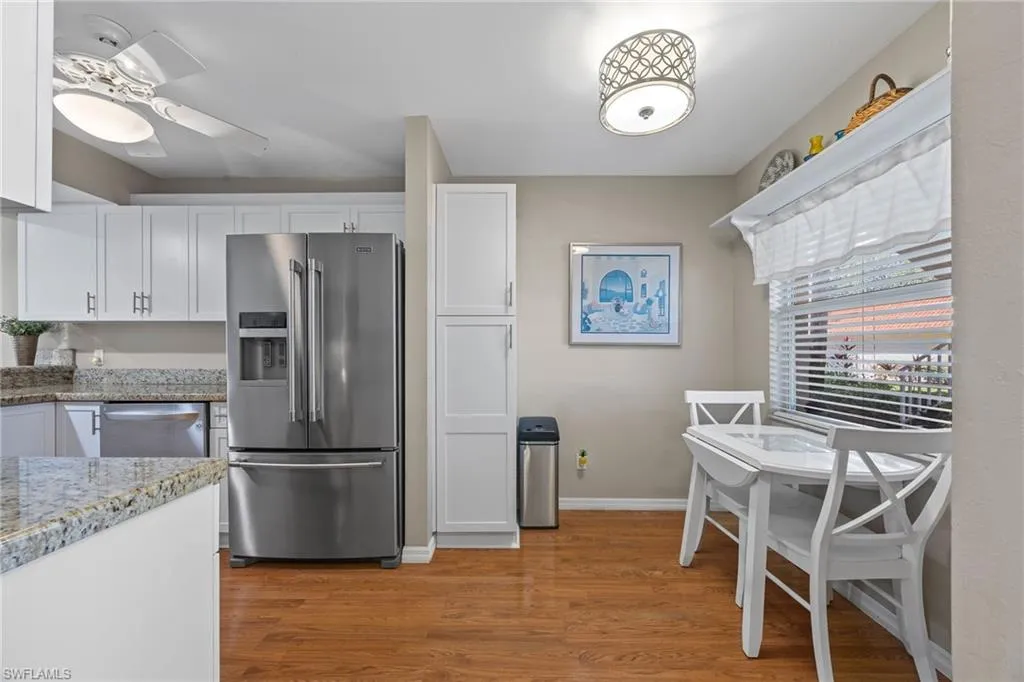 The spacious kitchen blends style and functionality with updated cabinetry, stainless steel appliances, a kitchen bar with plenty of seating, and a cozy breakfast nook—ideal for relaxed meals or entertaining friends. The primary suite offers comfort and privacy with an ensuite bath with a walk-in closet and tiled shower. Two guest bedrooms share a full bath, giving everyone their own comfortable retreat. Additional perks include in-residence laundry, a dedicated one-car garage, an assigned parking space, roll-down hurricane shutter on the lanai and upcoming new hurricane-impact windows scheduled for installation this spring, ensuring peace of mind for years to come.