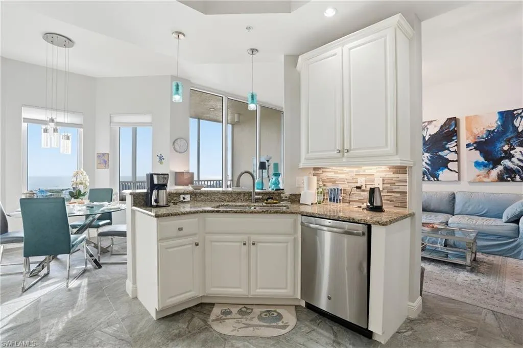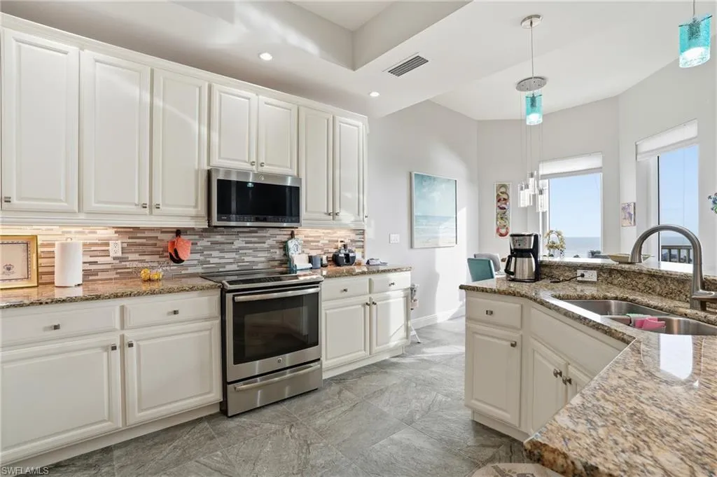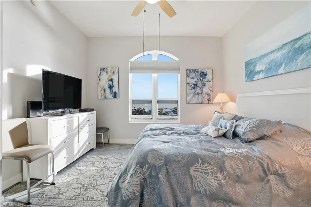 Experience coastal luxury at its finest in this beautifully updated three-bedroom, two-bathroom penthouse overlooking the Gulf and the serene lagoon waters of Fort Myers Beach. Flooded with natural light, this elegant residence showcases modern tile flooring throughout, a bright white kitchen with sleek cabinetry, and an open-concept living and dining area designed to frame breathtaking water views.