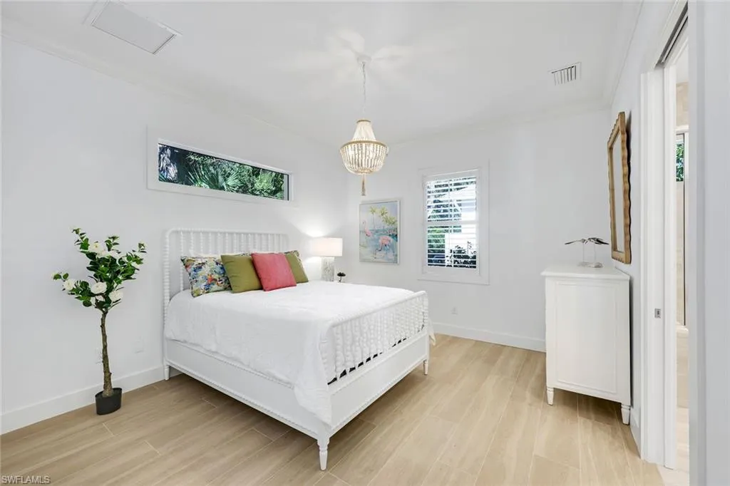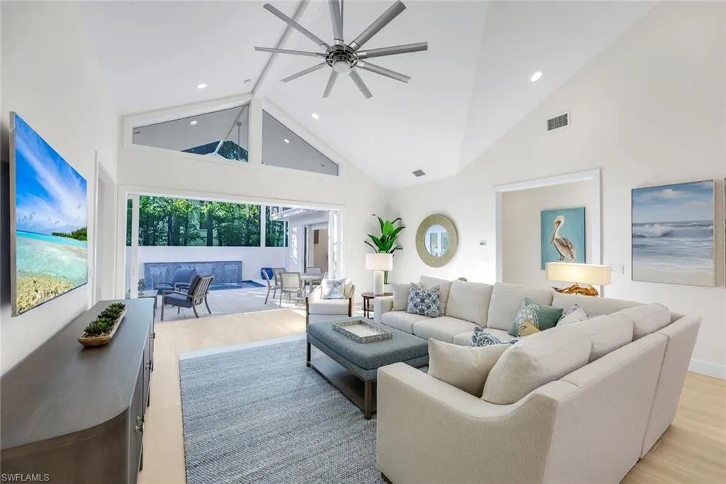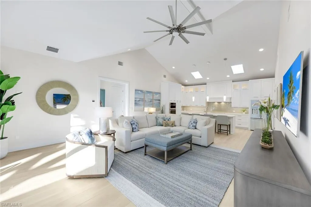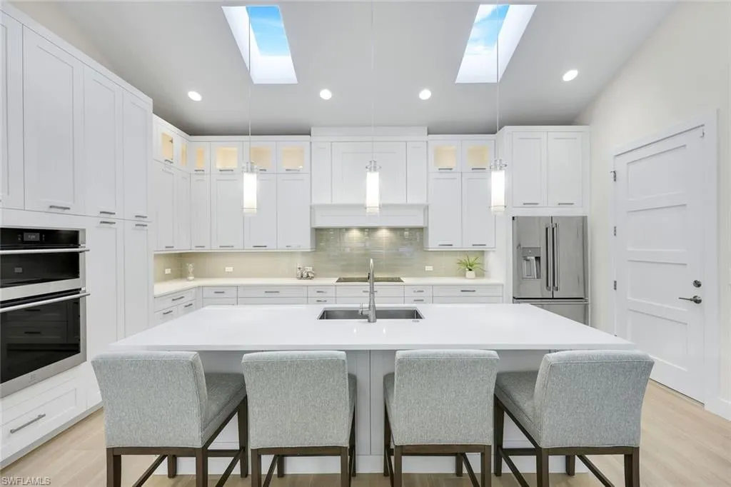 Magnificent residence in the up-and-coming Kona Kove neighborhood, just a few blocks from the brand-new JW Marriott that is currently under construction. This home features a great room with a soaring volume ceiling and skylights, seamlessly transitioning into an open kitchen. The kitchen showcases shaker-style cabinetry with illuminated glass-front upper cabinets, Electrolux stainless steel appliances including a built-in wall oven, microwave, cooktop, and stunning quartz countertops. At the back of the great room, pocket impact sliders open to the lanai, where a tranquil water feature and LED-lit pool create a private oasis. The primary suite, also with pocket impact sliders, provides a spacious retreat complete with custom his and hers walk-in closets. Its luxurious en-suite bath features a large walk-in shower with multiple shower heads and dual quartz-topped vanities. A guest suite offers its own bathroom with a walk-in shower and elegant cabinetry, while the second guest bedroom with en-suite enjoys a private entrance off the lanai—ideal for visitors seeking privacy. The screened lanai enhances the home’s indoor-outdoor living with peaceful water views and ambient lighting. HOA fees include both pool and lawn maintenance for effortless living. Ideally located close to downtown Naples, 5th Avenue shopping and dining, and the opportunity to join the exclusive Naples Bay Club for world-class amenities, this residence offers the perfect blend of luxury, convenience, and future value in one of Naples’ most exciting new areas.
