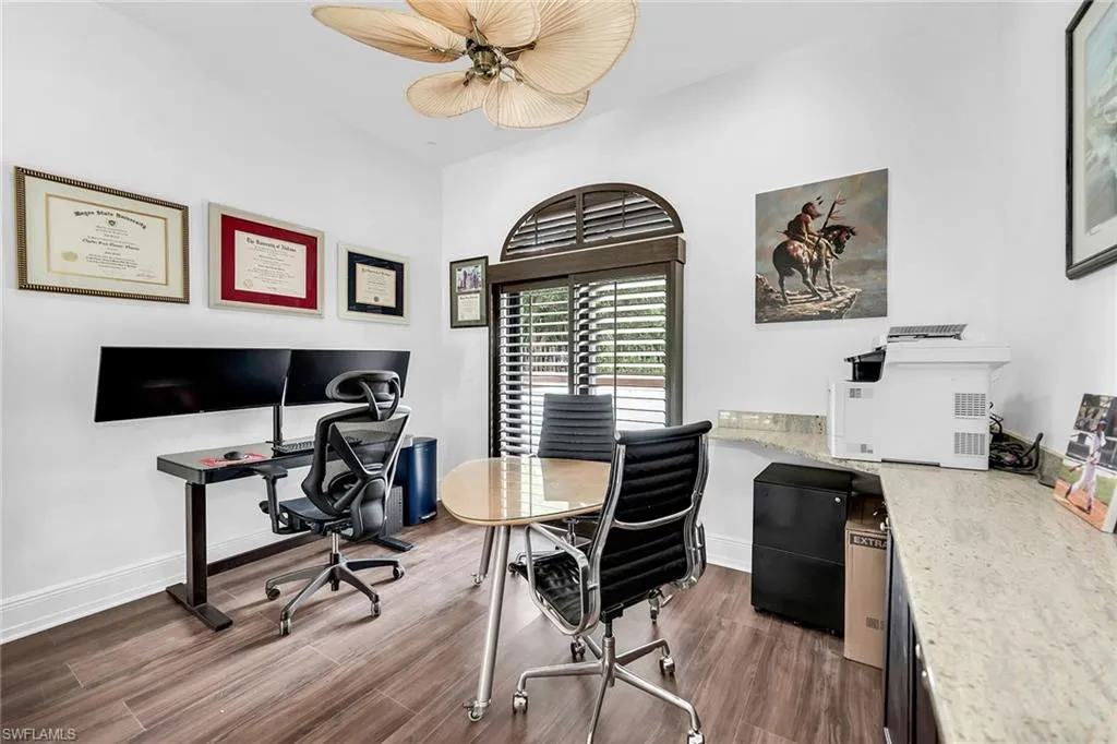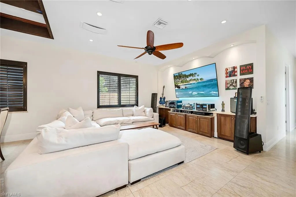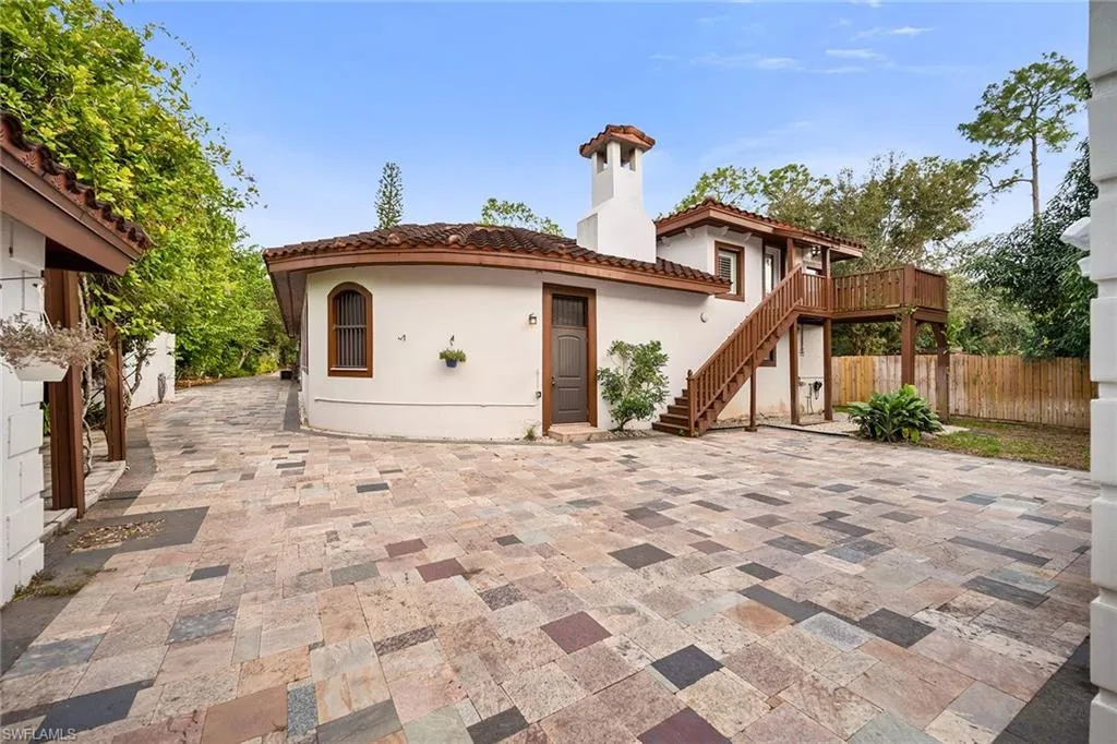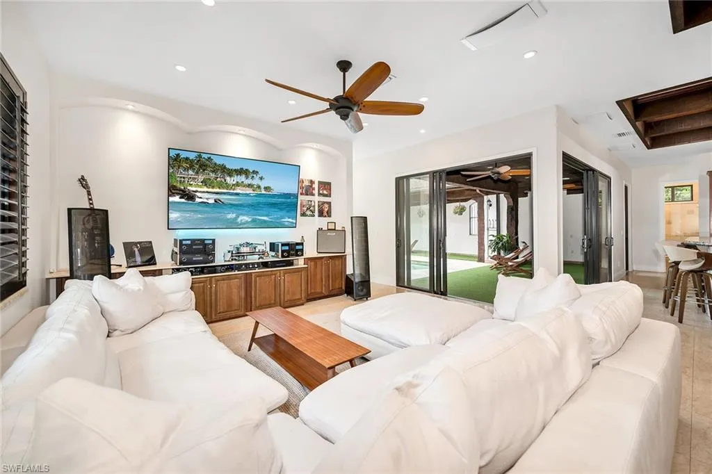 Welcome to your private Naples estate, a secluded and exceptionally unique 1.14-acre compound offering western exposure, unmatched convenience, and a rare multi-residence layout with no HOA restrictions or fees. Ideally located just off Golden Gate Parkway near Livingston, this gated property includes a grand 6-bedroom, 5.5-bath main residence, two separate one-bedroom, one-bath guest apartments with kitchenettes, a standalone gym, and resort-inspired outdoor living centered around an impressive courtyard. A rare, marble-finished driveway joins the private entry gate, impact doors and windows, newer HVAC system, whole-house generator, buried propane tank, and whole-house tankless water heater that delivers endless hot water to introduce the comfort, efficiency, and luxury this estate provides. Inside the main home, marble flooring spans the living areas, with warm wood flooring in the bedrooms and tile in the baths. Custom coffered ceilings, French doors, a fireplace, and a whole-home surround system further elevate the living experience. Four bedrooms sit at the front of the home, while the primary suite and sixth bedroom enjoy a peaceful setting at the rear. Expansive glass doors open to the courtyard, creating seamless indoor-outdoor living ideal for everyday comfort and entertaining.The chef’s kitchen is exceptionally well-designed with both gas and electric appliances, granite countertops and backsplash, a stacked-stone accent wall, oversized island with sink, mounted main sink, stainless steel appliances including a gas range with pot filler, wall oven, built-in microwave, refrigerated drawers, wine cooler, refrigerator/freezer, and newer dishwasher. The primary bath offers a built-in massage table, soaking tub, dual sinks with makeup counter, and a luxurious five-showerhead walk-in shower. Two guest bedrooms include en-suite baths, and both a half bath and pool bath serve the main living and courtyard areas. The stunning screened courtyard is designed for year-round enjoyment with a heated pool, turf and travertine surround, and covered outdoor living with ceiling fans. The full outdoor kitchen features an Argentine grill, cooktop and griddle, deep fryer, refrigerator, bar area, and granite counters with matching backsplash—perfect for entertaining on any scale. Beyond the courtyard, the backyard becomes a private park with a peaceful pond, charming bridge, fruit trees, and multiple areas for quiet relaxation. A separate equipment building houses the water system. This exceptional Naples compound offers privacy, versatility, and true resort-style living, creating a rare opportunity for those seeking a one-of-a-kind estate.