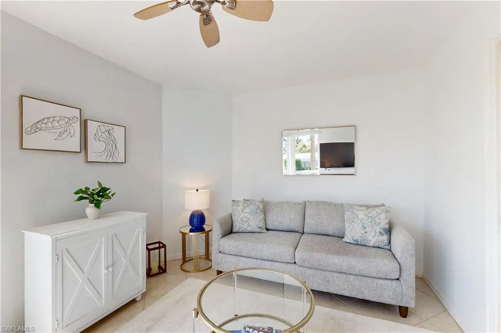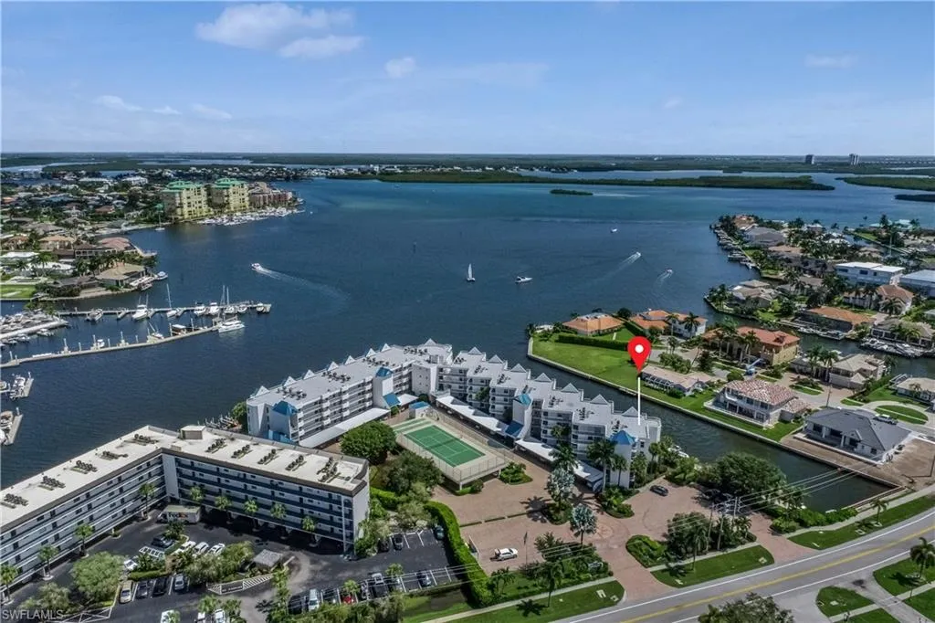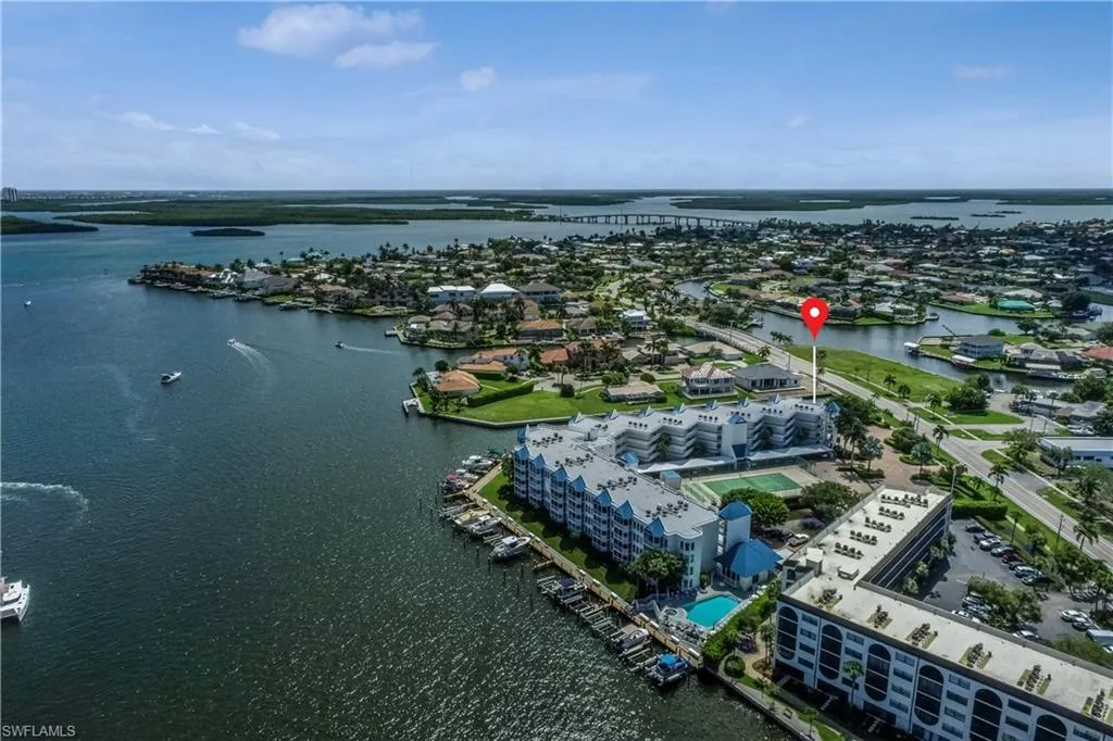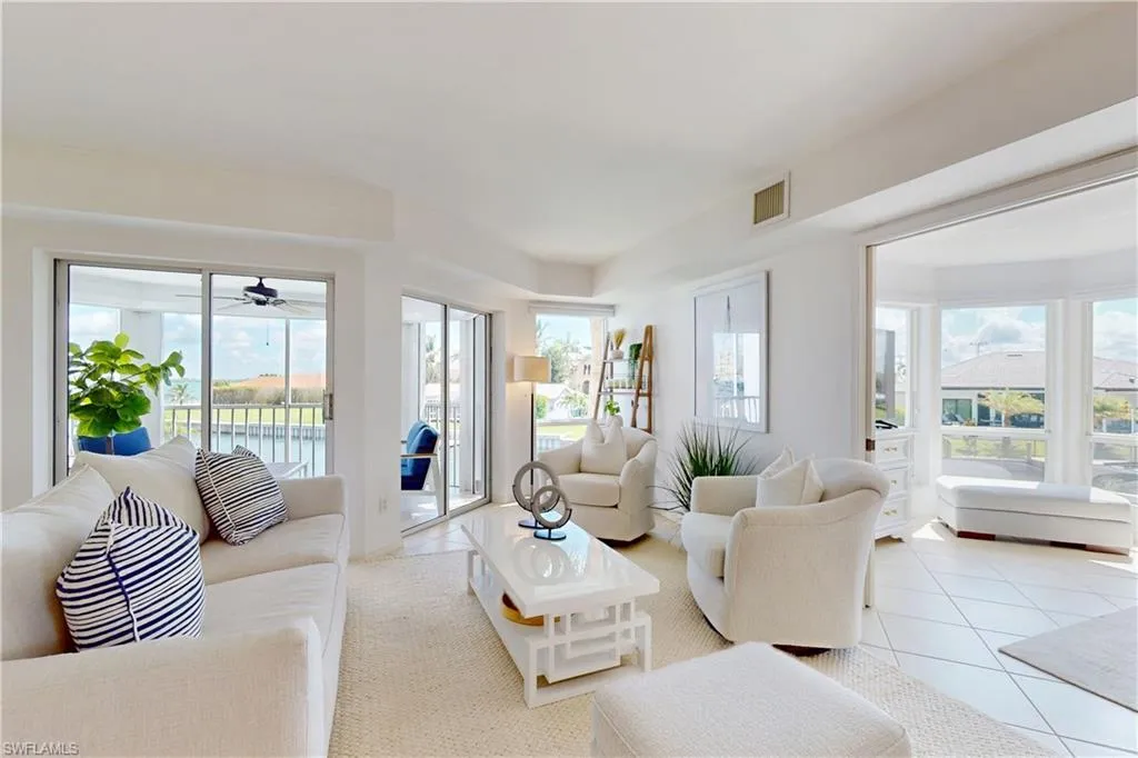 Discover an exceptional coastal retreat perfectly positioned on the Marco River. This impeccably maintained TURNKEY 2-bedroom + den, 2-bath corner residence captures sweeping water views from the moment you step inside. Sunlight fills every room, highlighting the home’s stylish furnishings, freshly painted interiors, and breezy coastal design. Hurricane-impact windows with electric shutters provide both comfort and peace of mind, while the screened lanai offers a front-row seat to dolphins, passing boats, and the natural beauty of the river.
